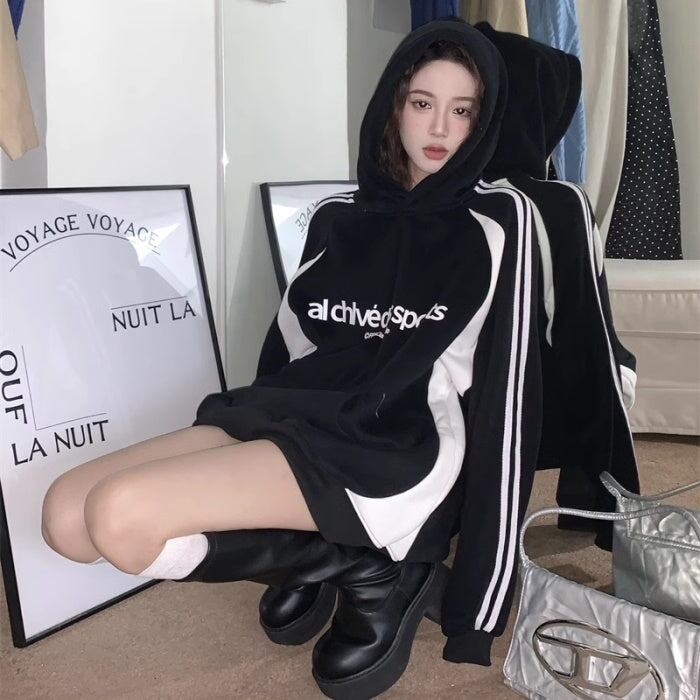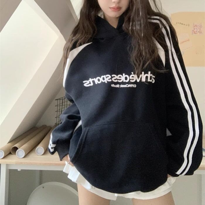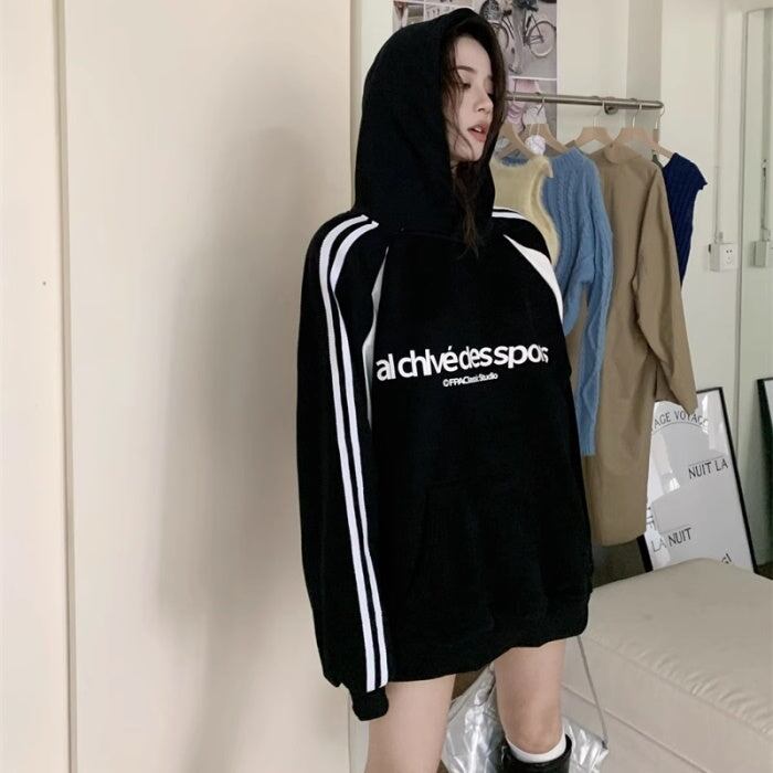 スポーティ パーカー レディース 韓国 ファッション プルオーバー ロゴ ライン 裏起毛 フーディ トップス オーバーサイズ