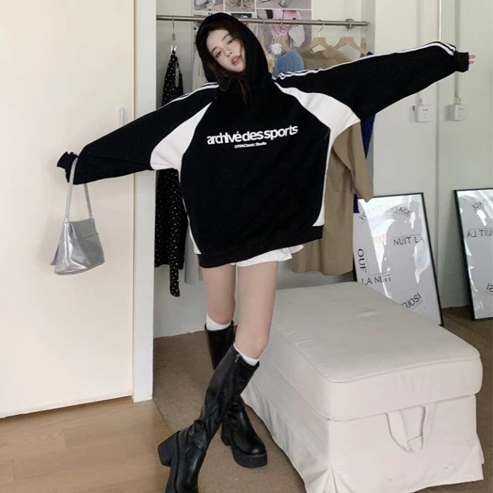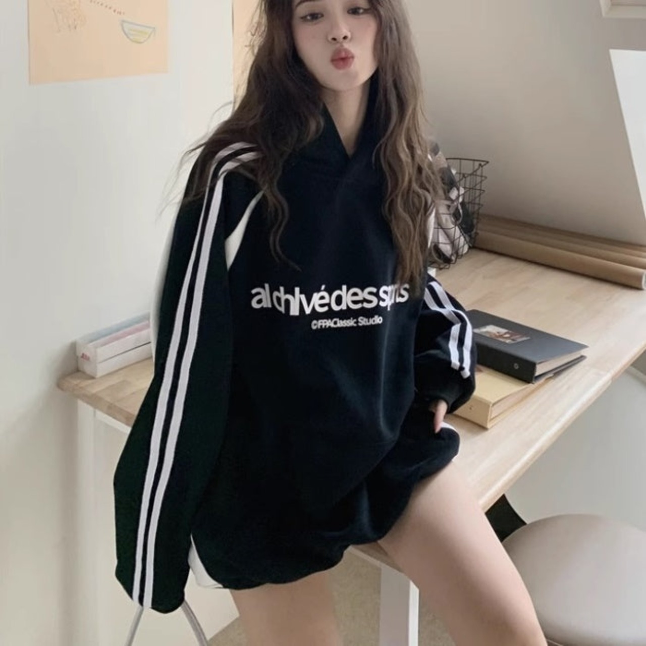 スウェット パーカー レディース 韓国 ファッション 黒パーカー ロゴ ライン袖 おしゃれ 秋冬 裏起毛 トップス