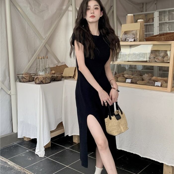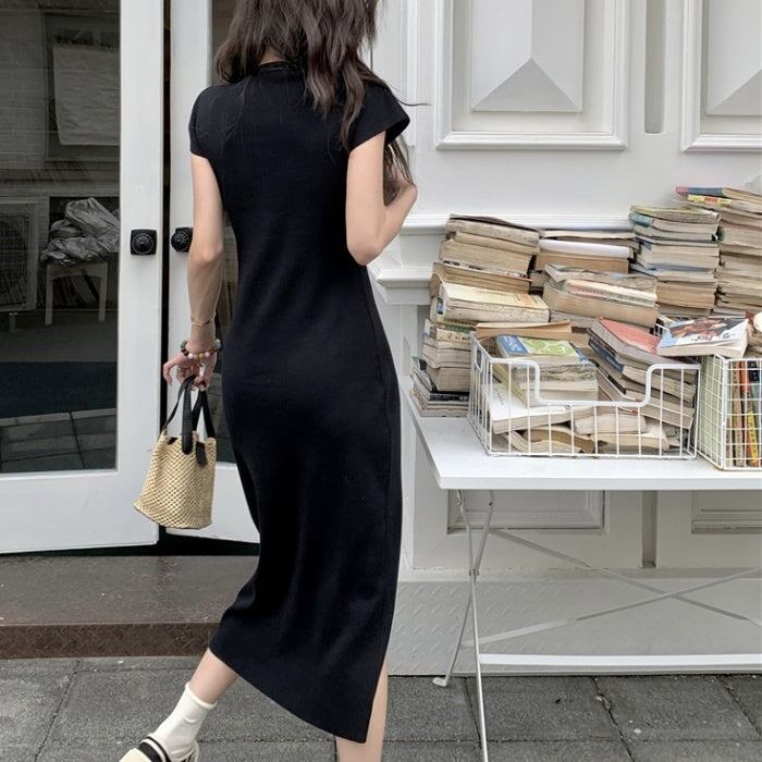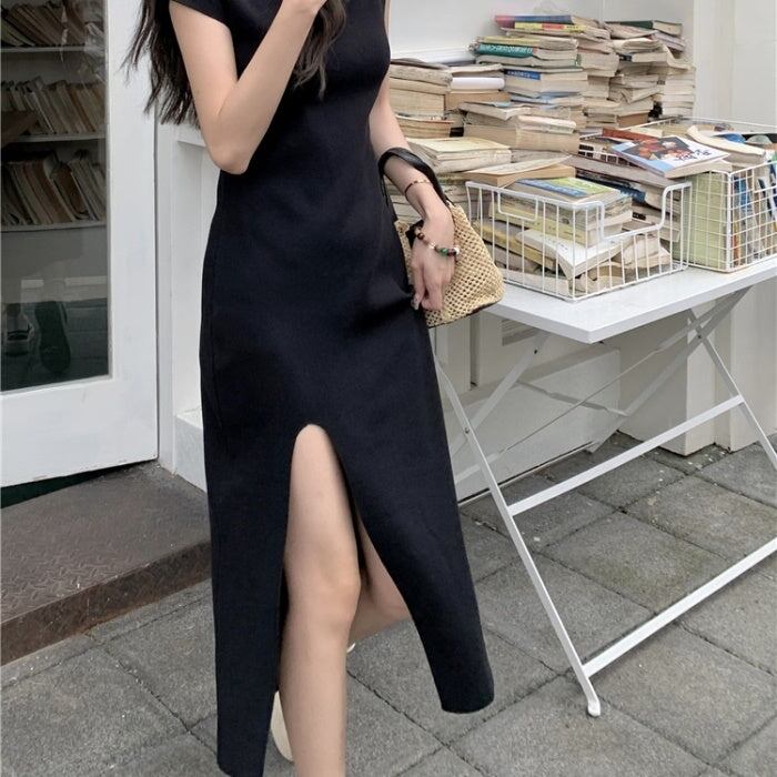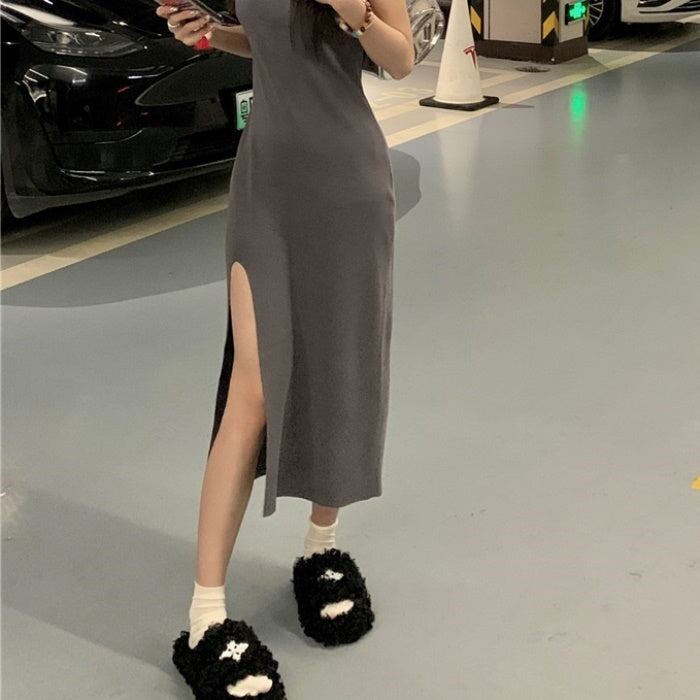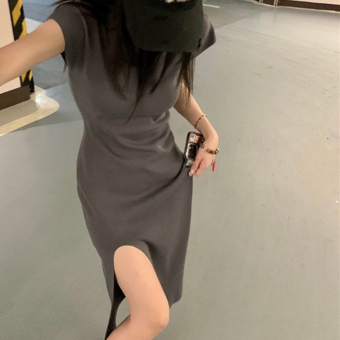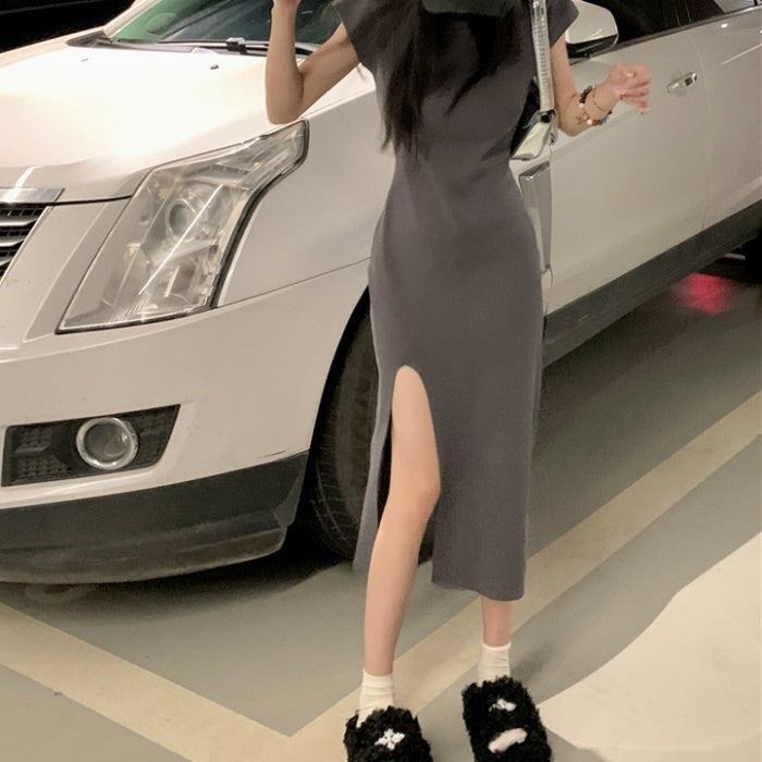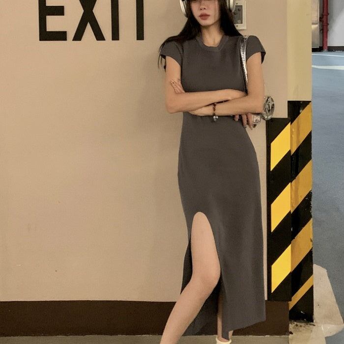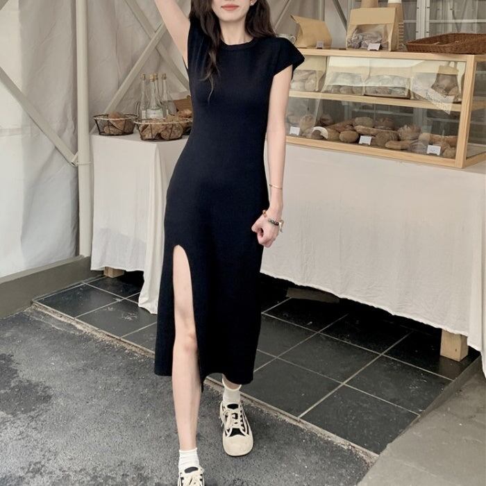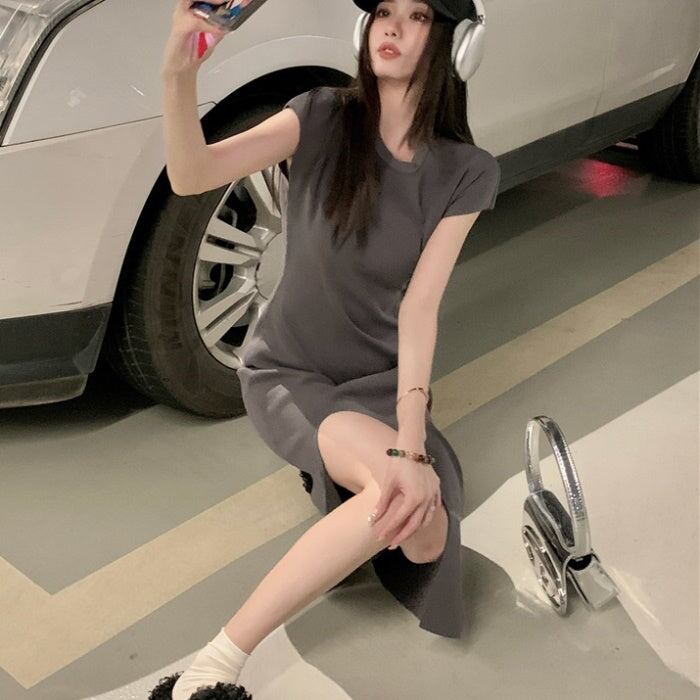 カットソーワンピース スリットワンピ レディース 韓国 ファッション 無地ワンピ フレンチスリーブ 半袖 夏ワンピ タイト ミディ丈