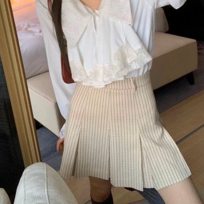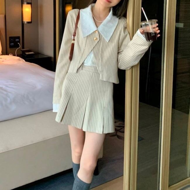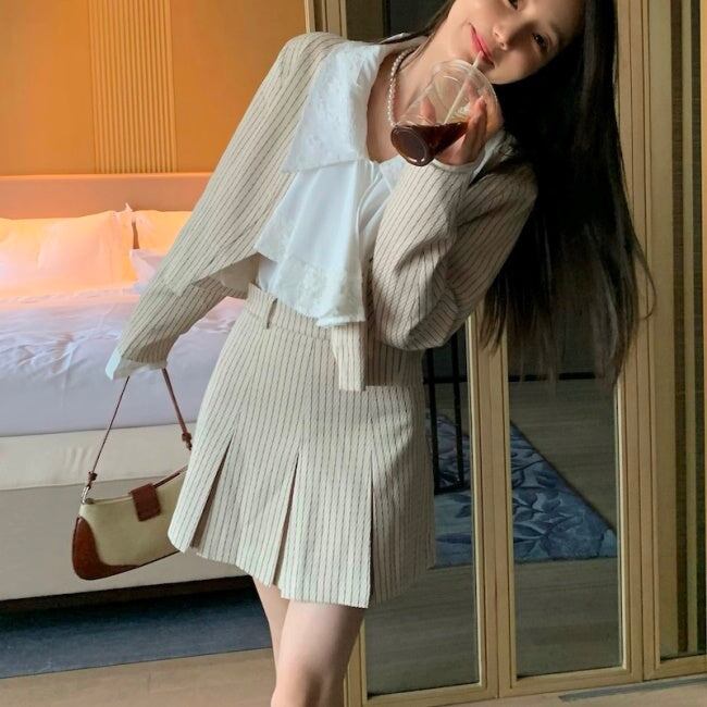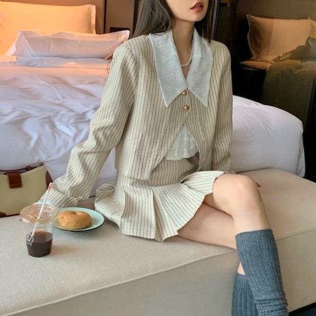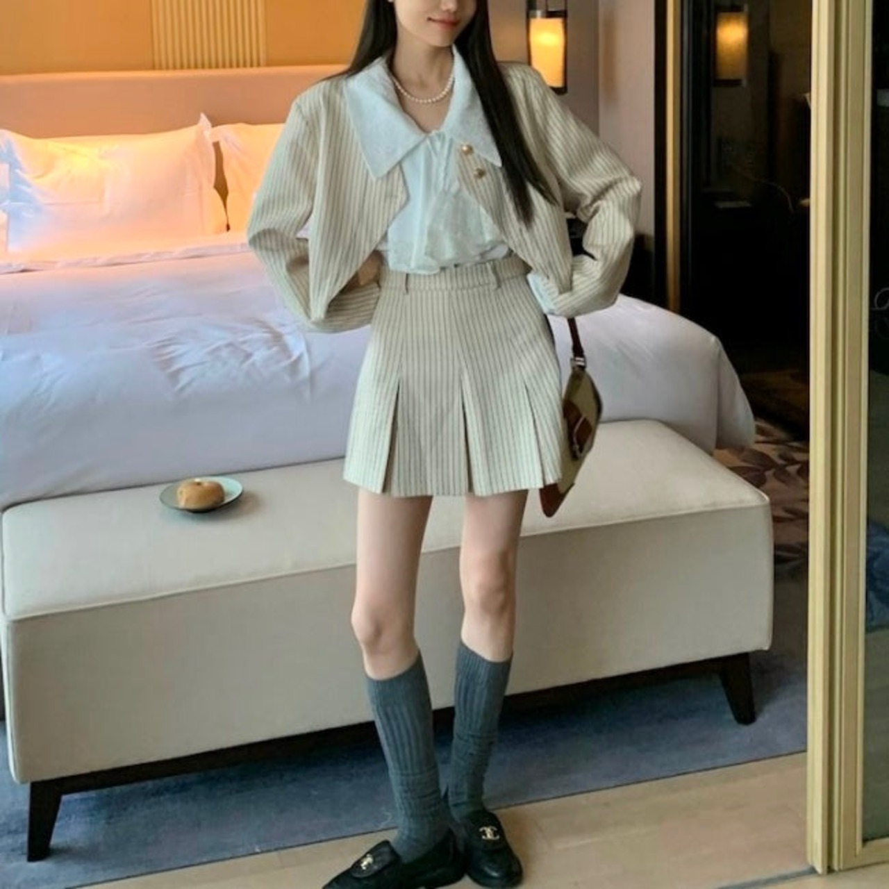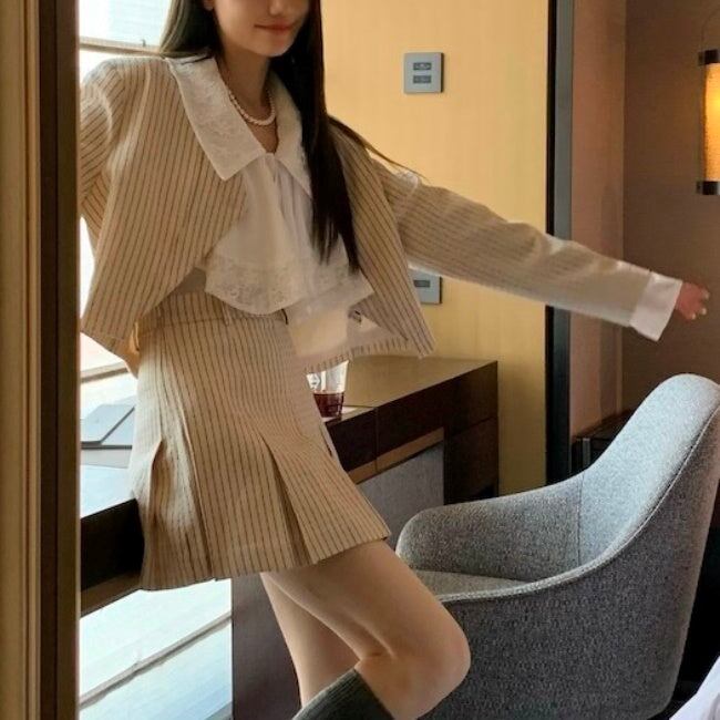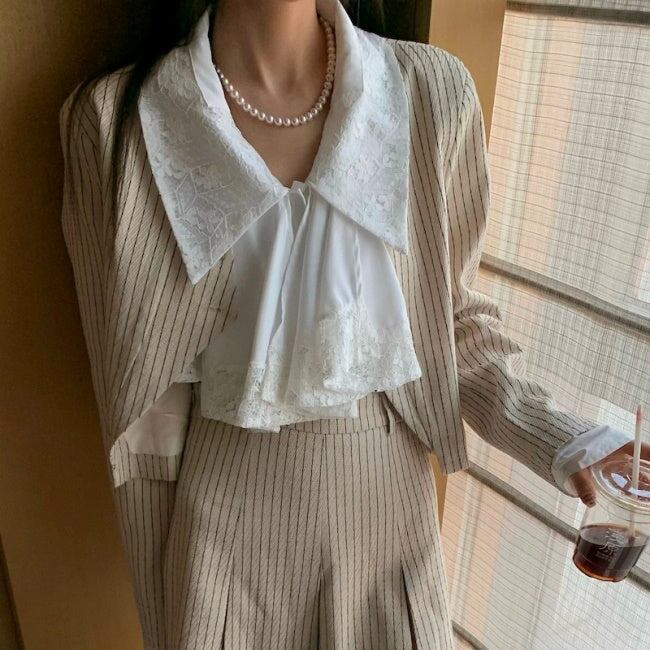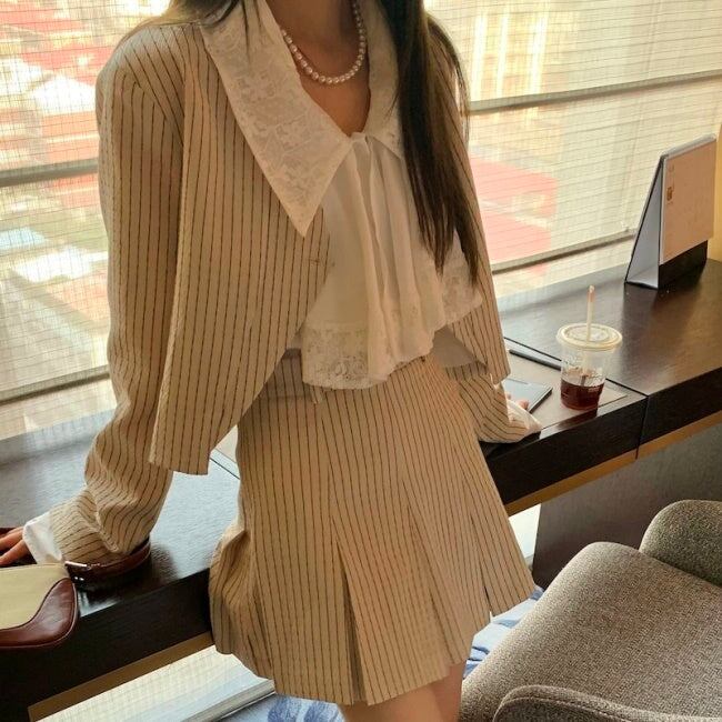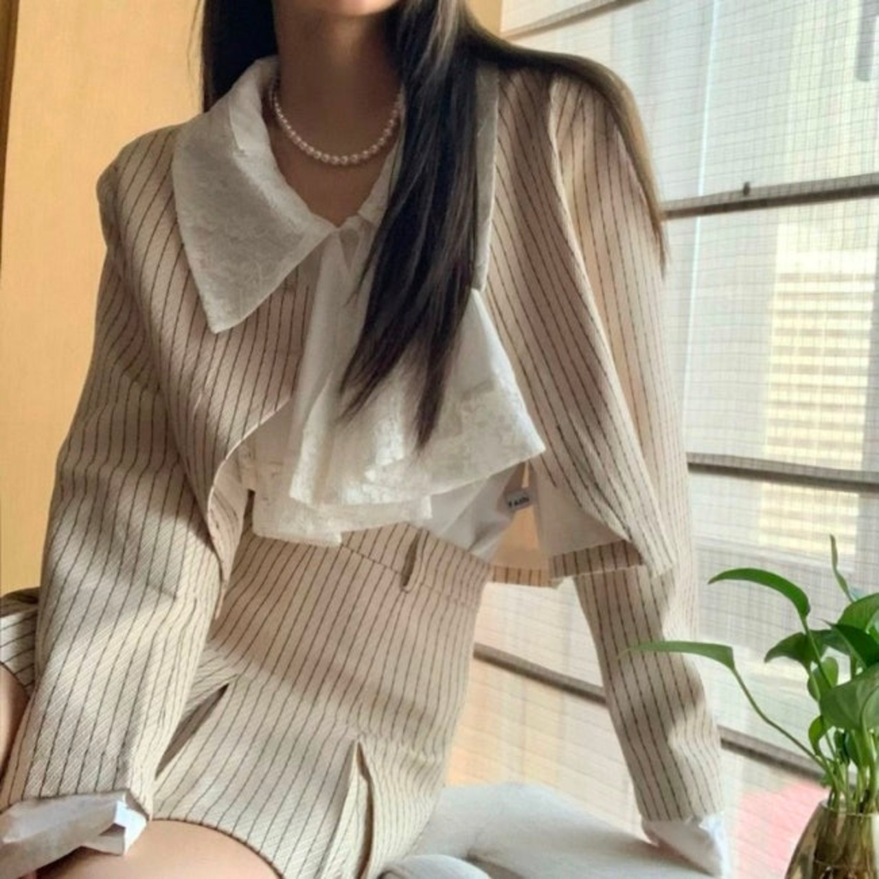 セットアップ 3点セット レディース 韓国 ファッション ボウタイシャツ ジャケット プリーツスカート ストライプ 春スーツ お呼ばれ 上品 かわいい スーツ 刺繍レース