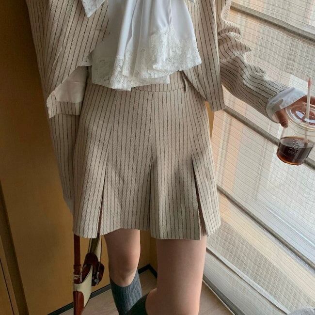 セットアップ 3点セット レディース ストライプ ジャケット ミニスカート フリルブラウス 韓国 お呼ばれ セット
