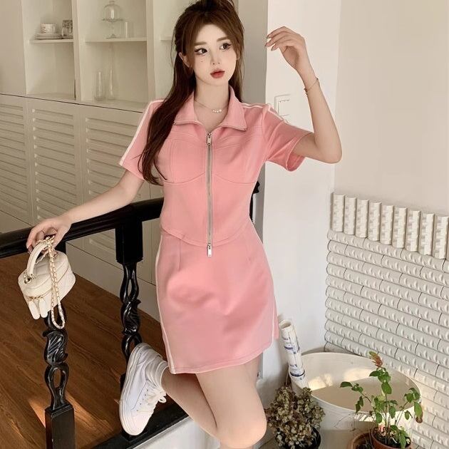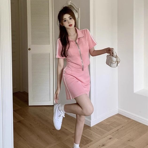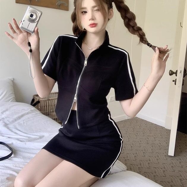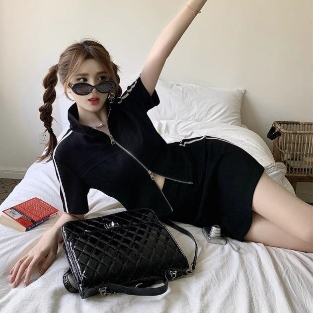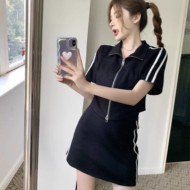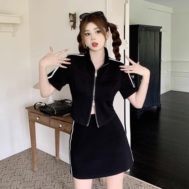 セットアップ サイドライン スカート レディース 韓国 ファッション カットソー ジップカーデ ラインスカート 半袖 カットソー 2ピースセット ロングスカート