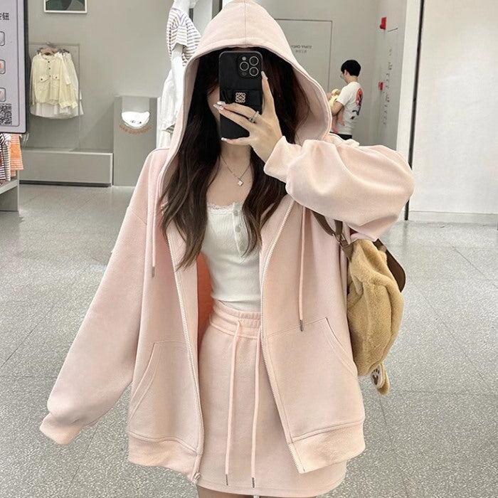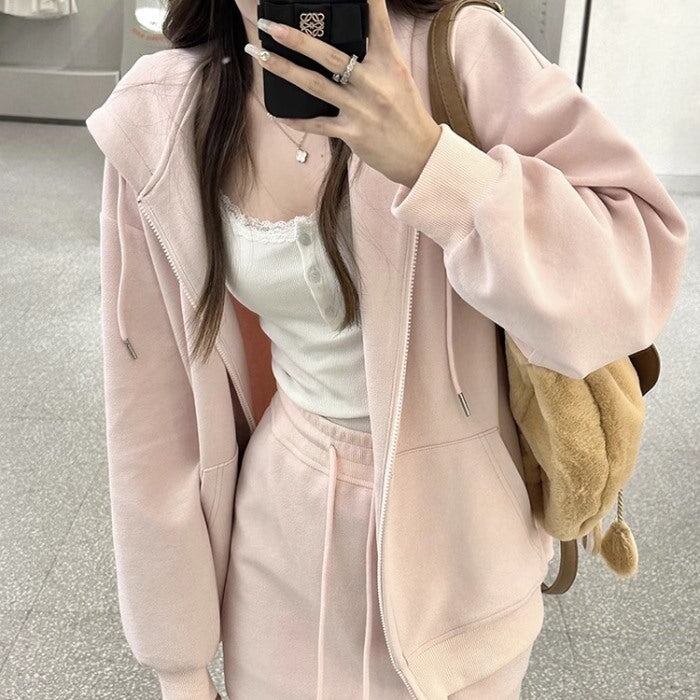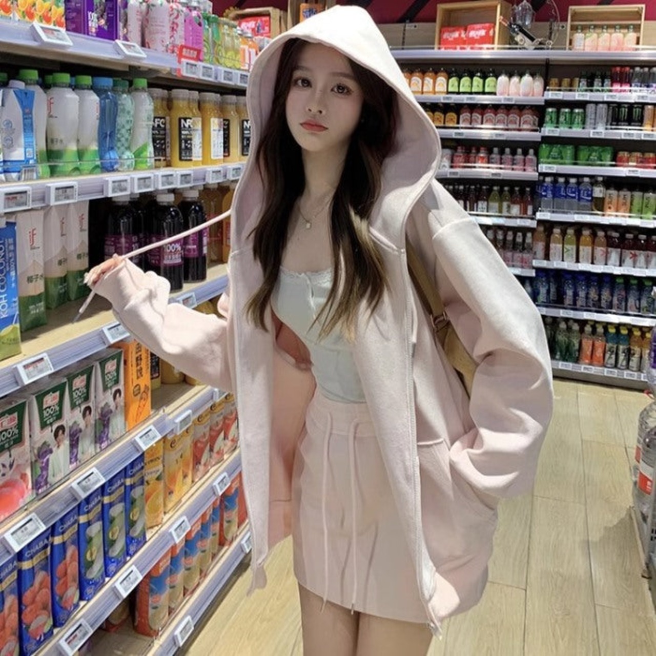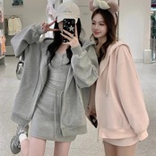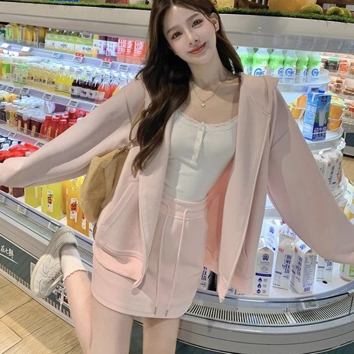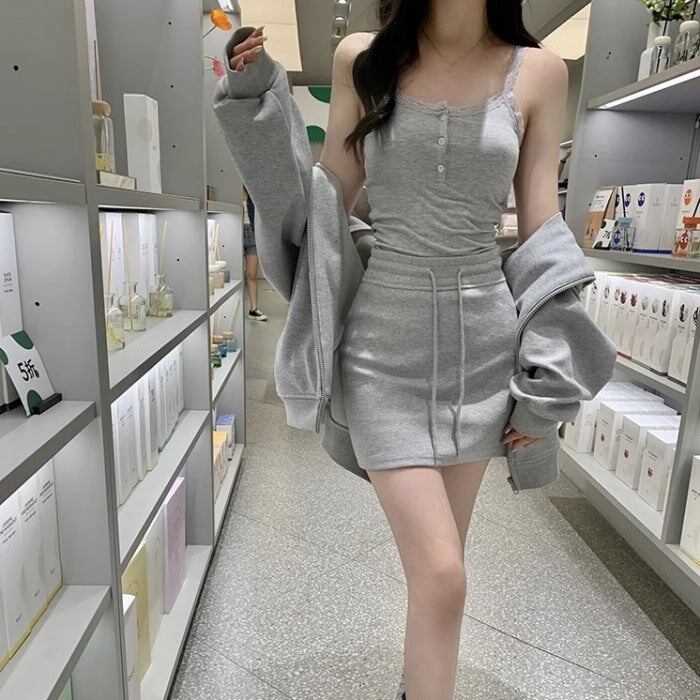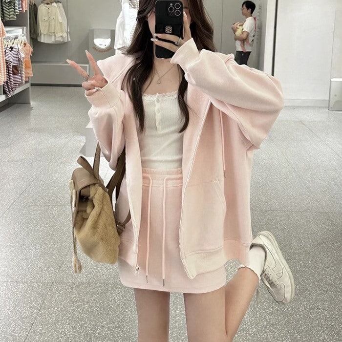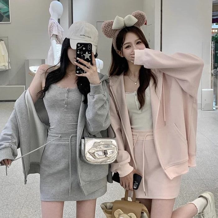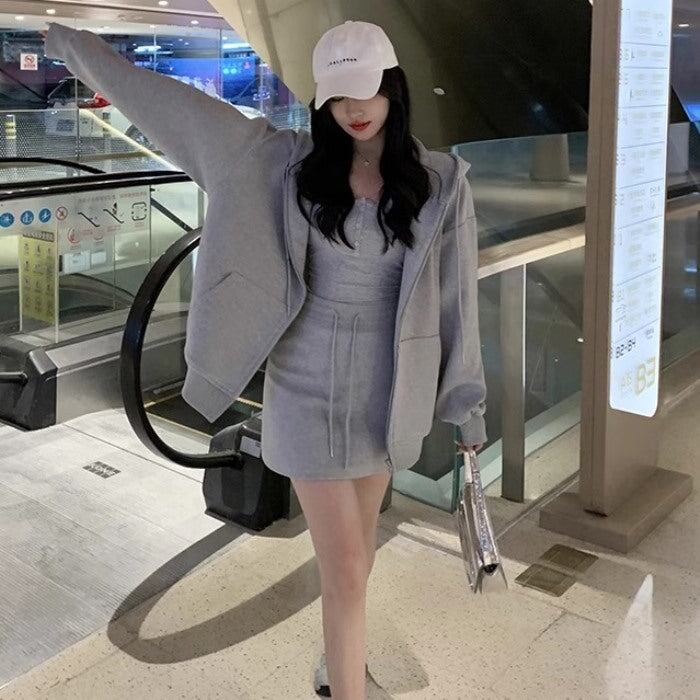 3点セット ジップパーカー レディース 韓国 ファッション ミニスカート キャミソール ビッグパーカー タイトスカート 秋冬コーデ セットアップ スウェットパーカー スカート