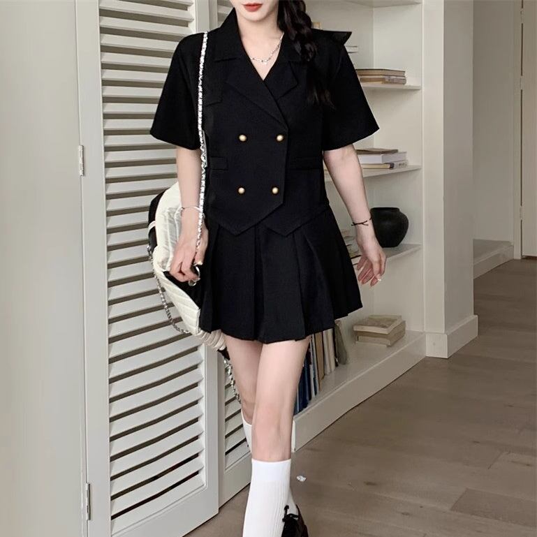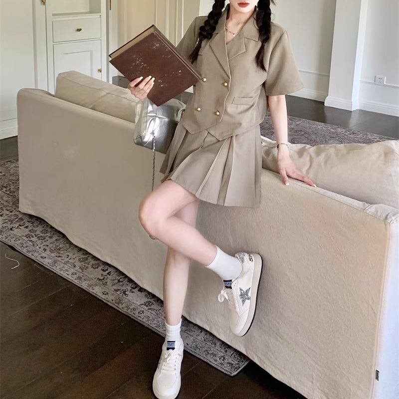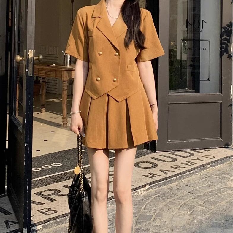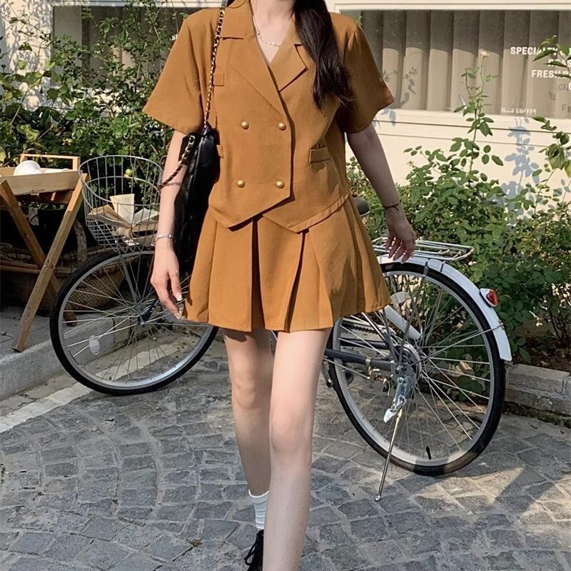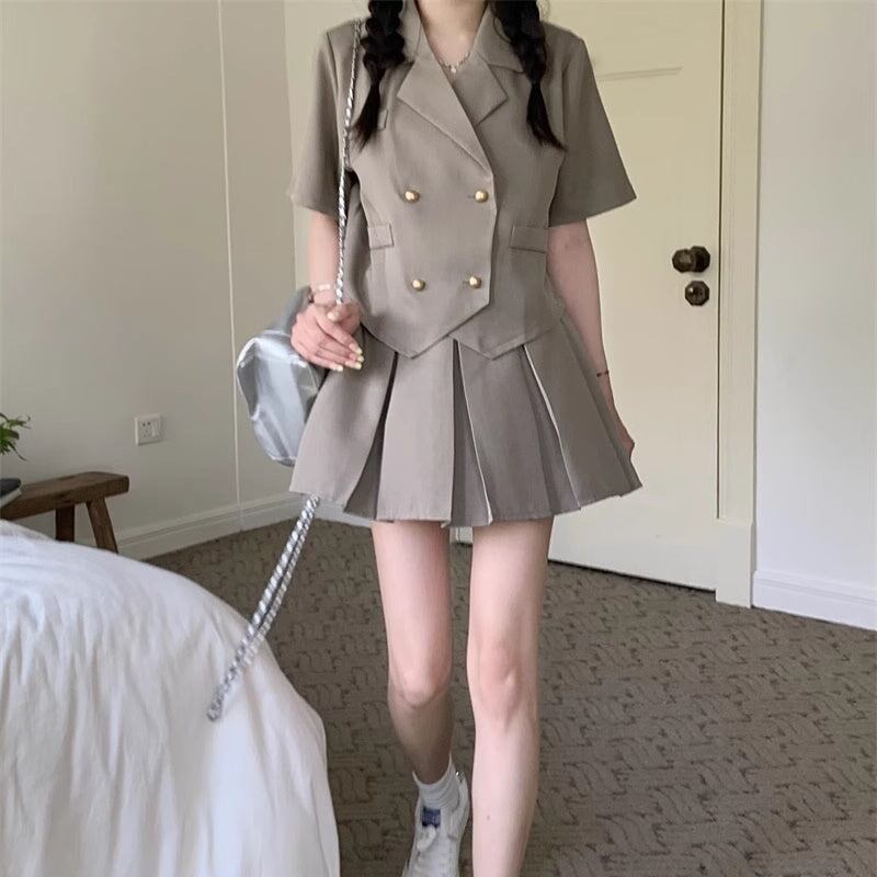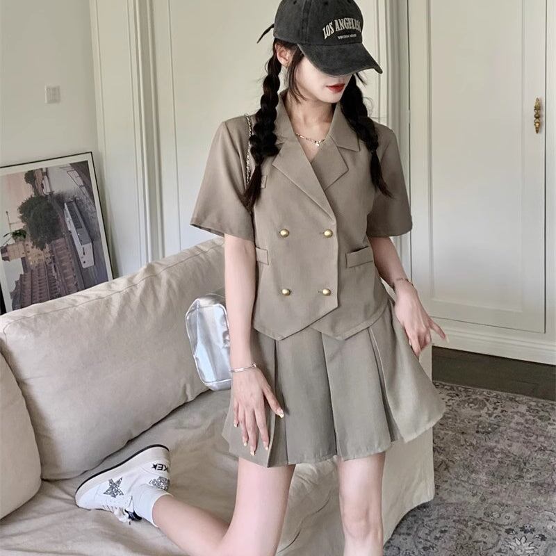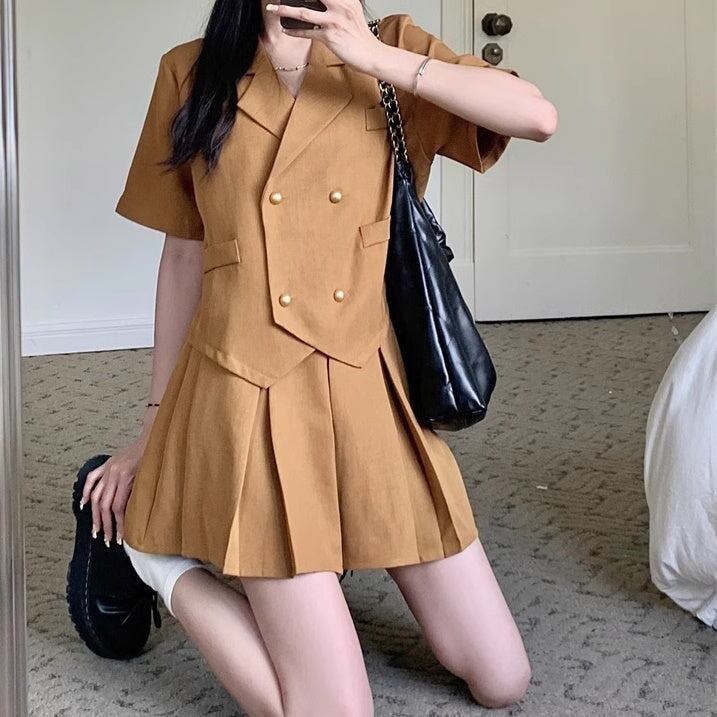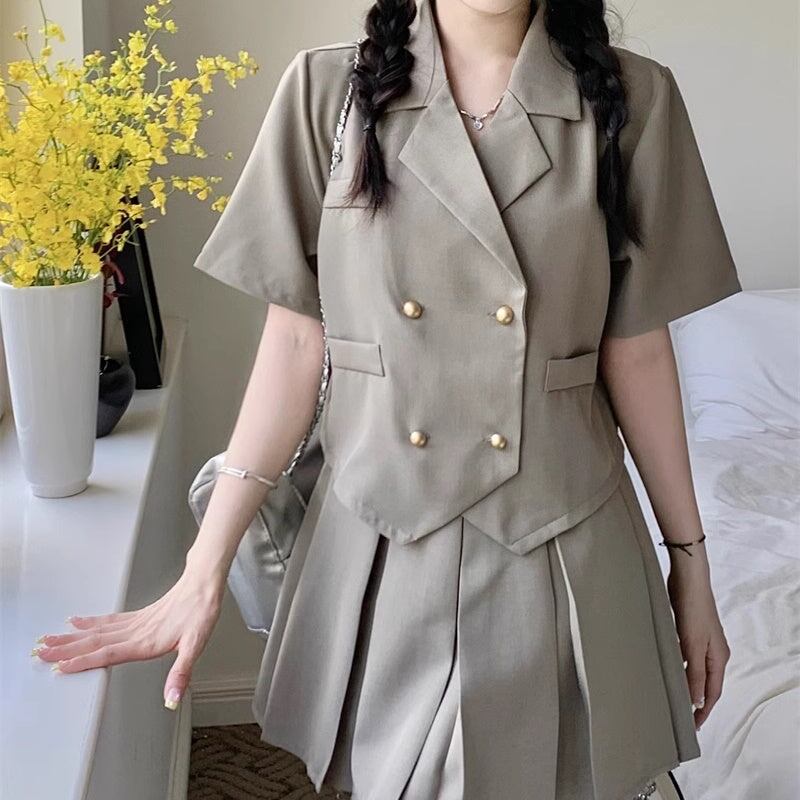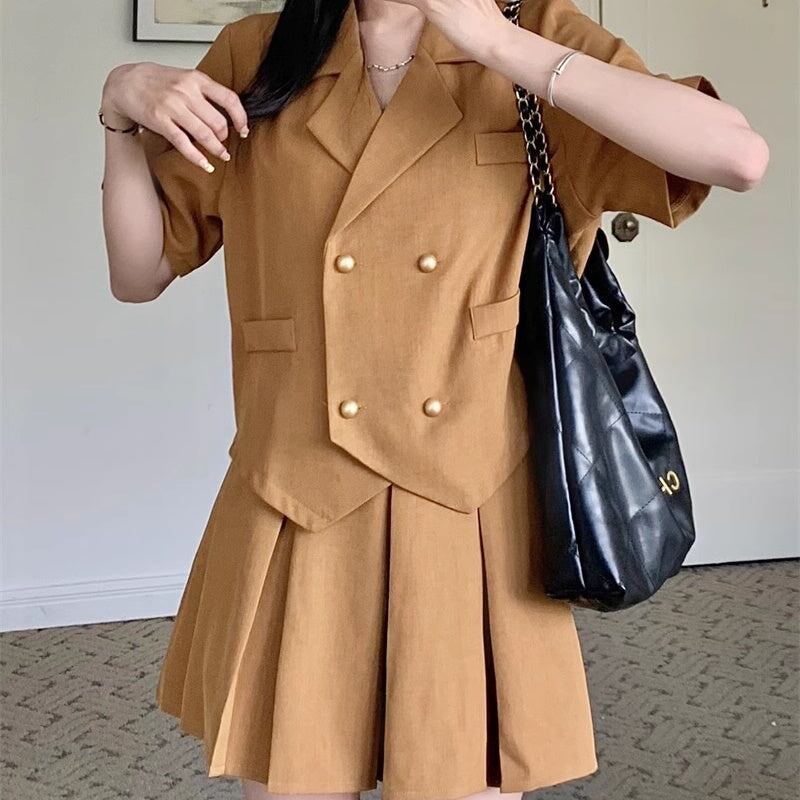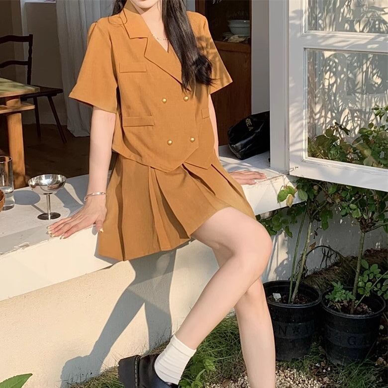 セットアップ ジャケット プリーツスカート ダブルボタン 半袖ジャケット 夏スーツ 金ボタン おしゃれ シャツジャケット ミニスカート プリーツスカート お呼ばれ サマー