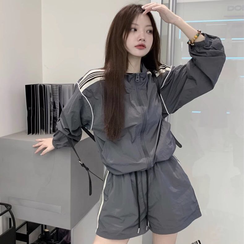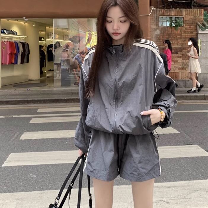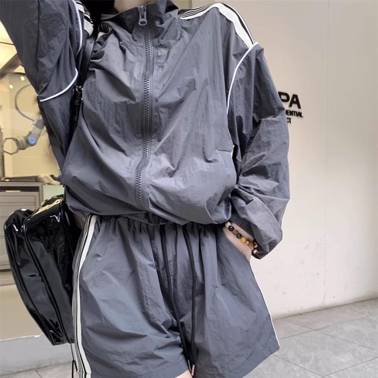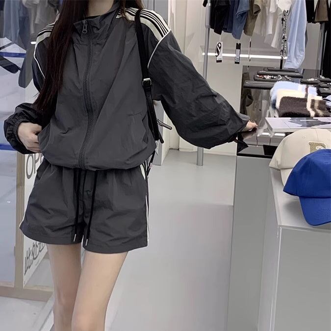 セットアップ レディース ナイロン ジャージ 韓国 ファッション ブルゾン ショートパンツ サイドライン ジャージ 上下セット スポーティー