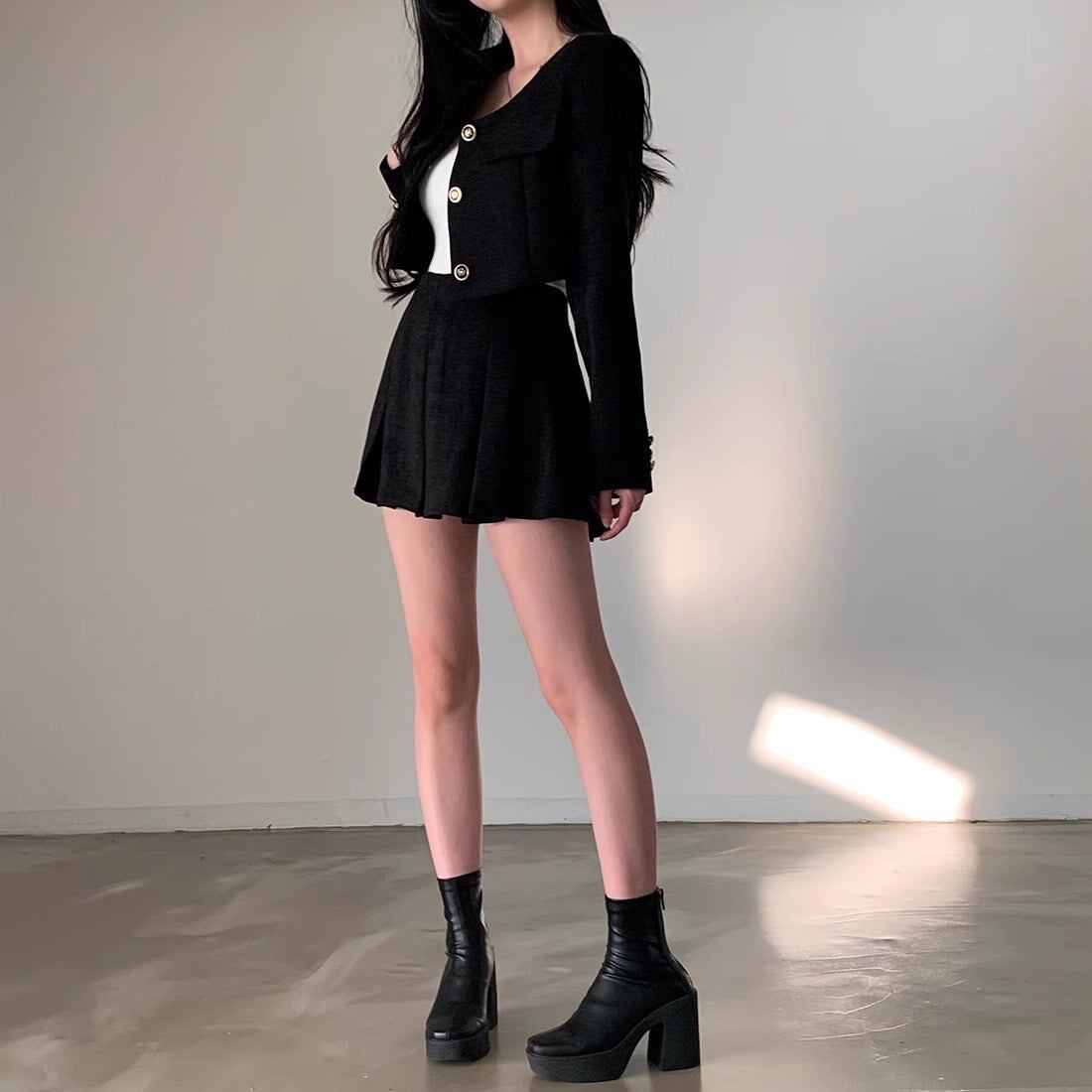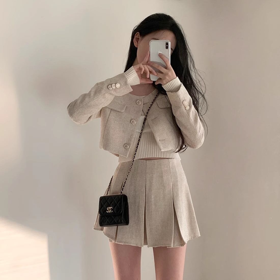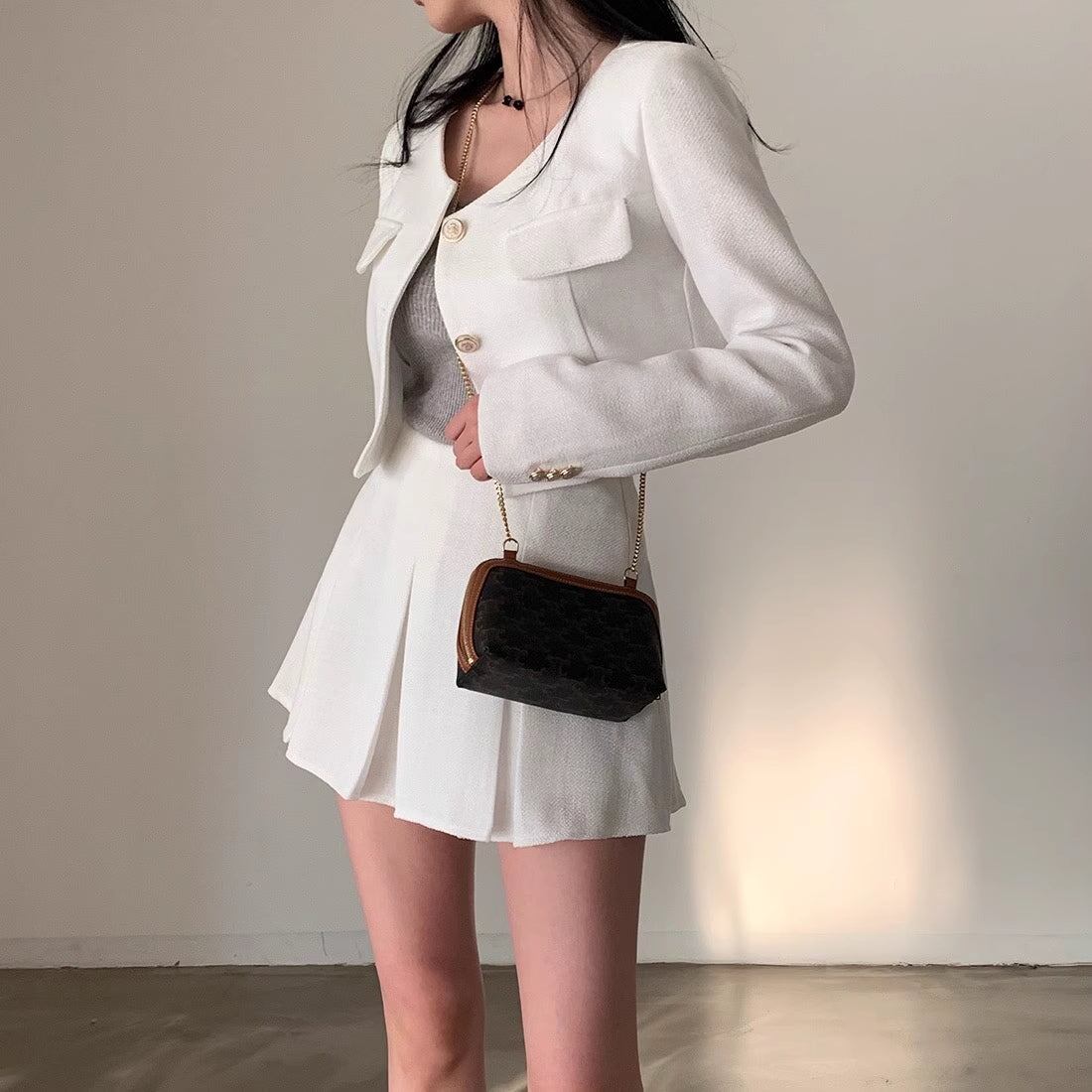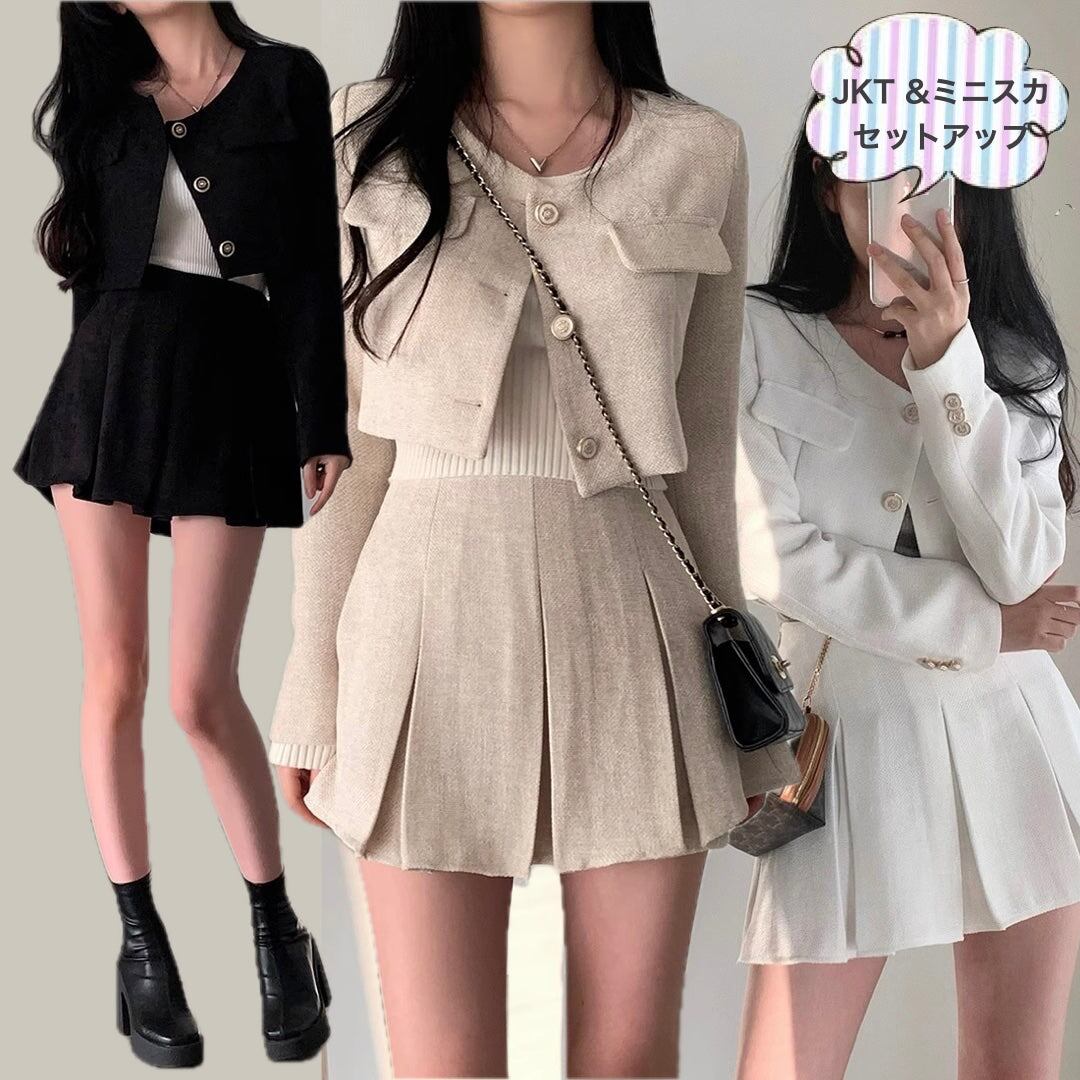 セットアップ レディース ノーカラー ジャケット ミニスカート 上下セット 韓国 ファッション Aライン プリーツスカート