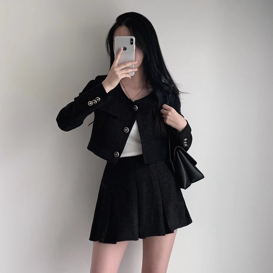 セットアップ スカートスーツ レディース 韓国 ファッション メタルボタン オーカラージャケット プリーツスカート Aライン フレアスカート