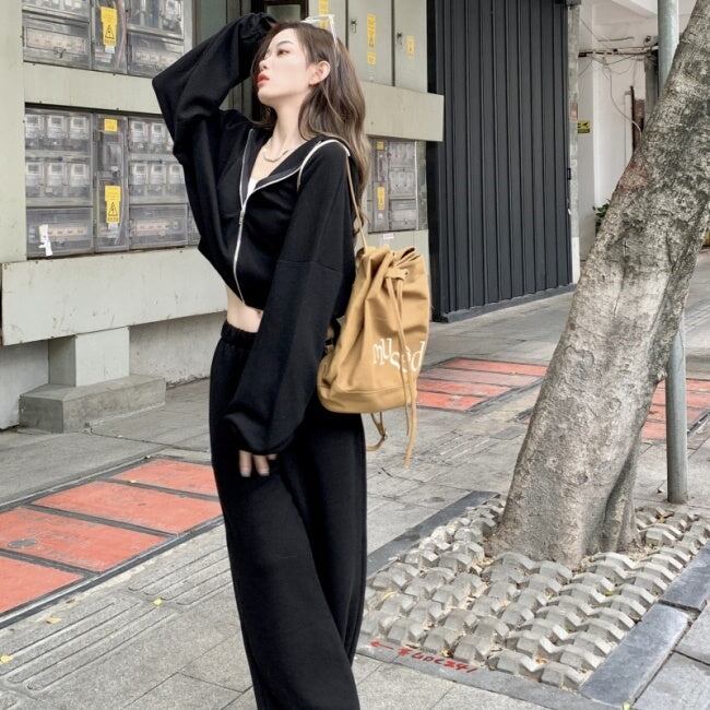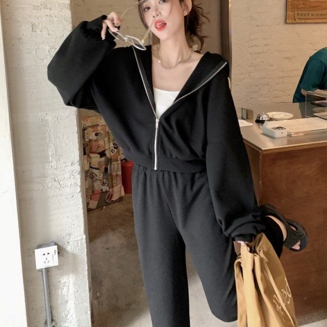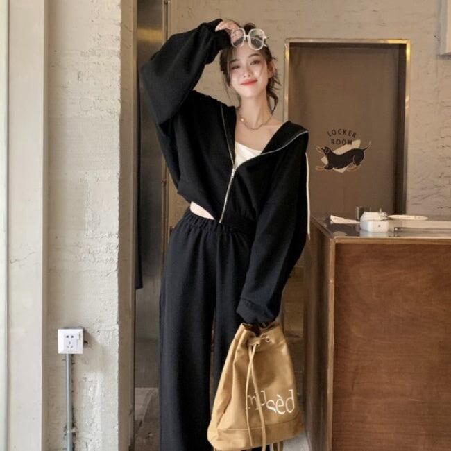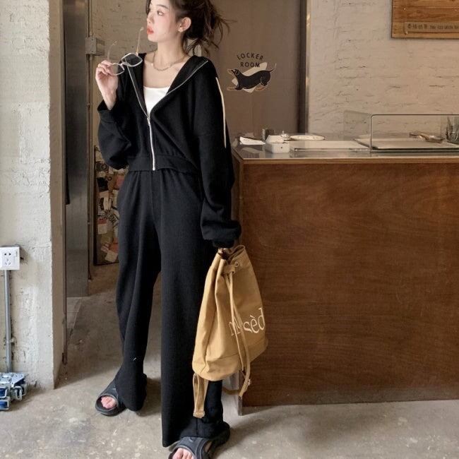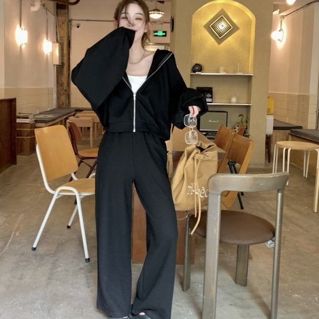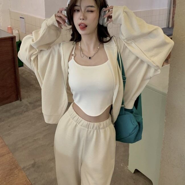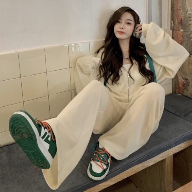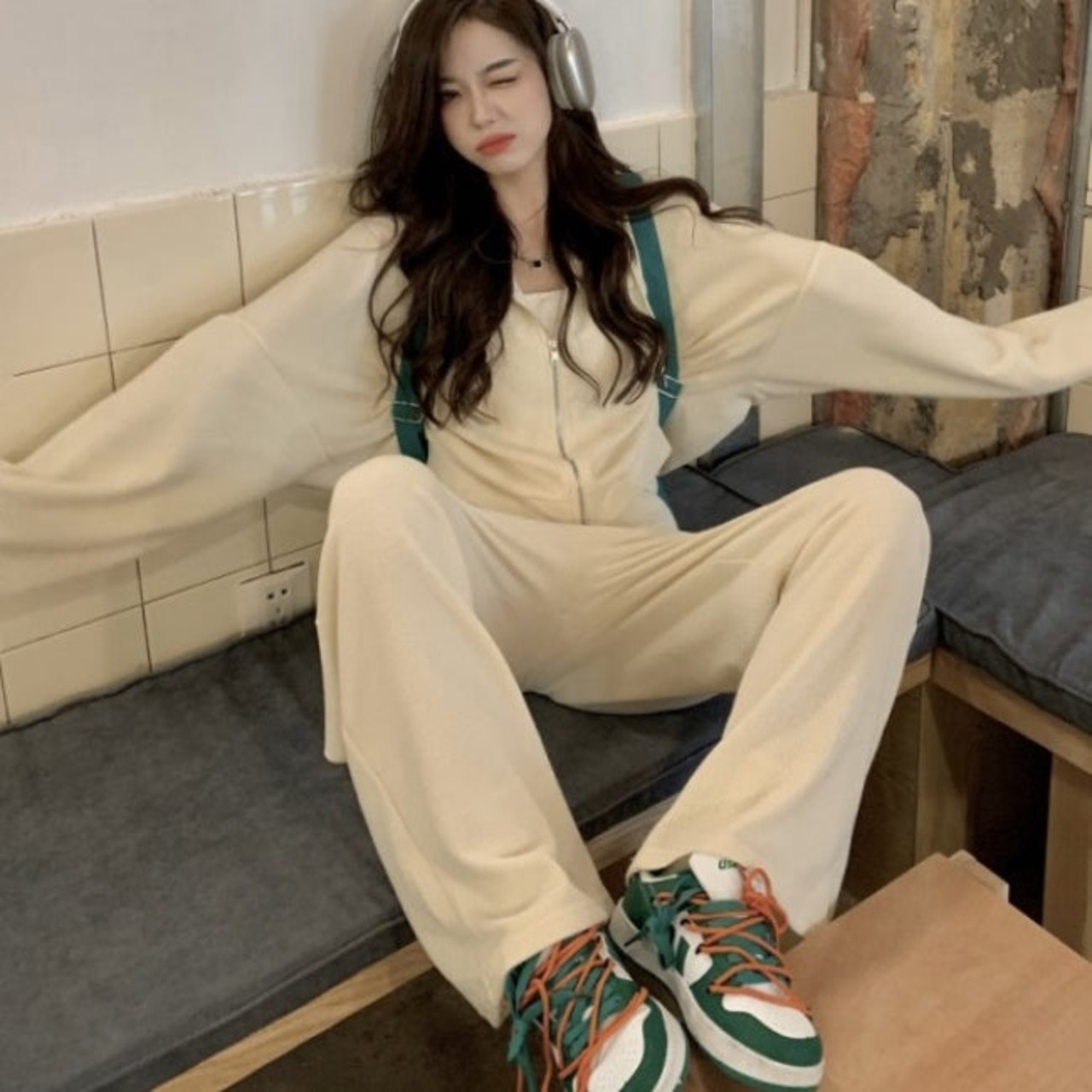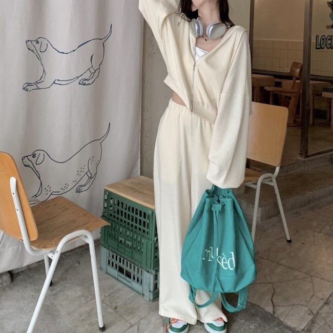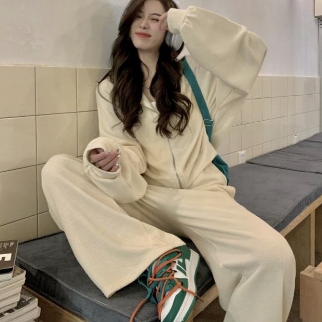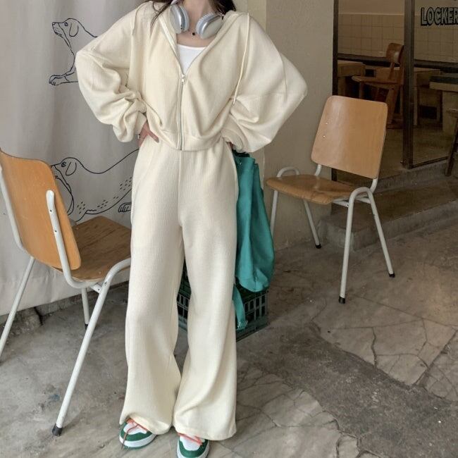セットアップ パーカー レディース 韓国 ファッション ワッフル ジップパーカー ワイドパンツ 長袖