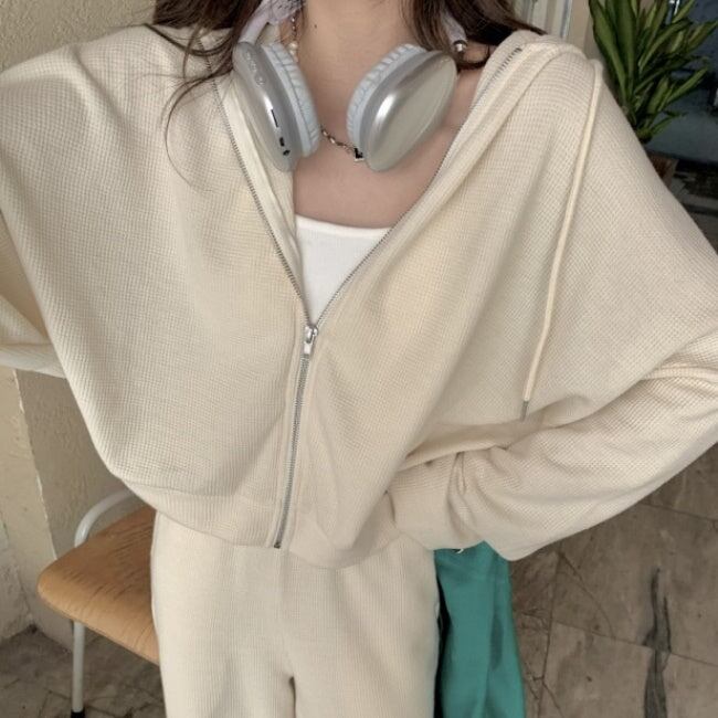 セットアップ レディース パーカー 韓国 ファッション オーバーサイズ ワッフル ジップパーカー ワイドパンツ 上下セット
