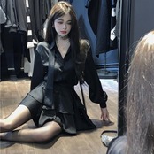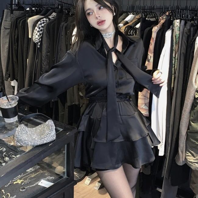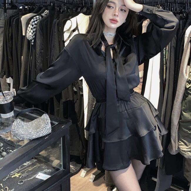 セットアップ ブラウス フレアミニスカート レディース 韓国 ファッション リボンタイ 黒 上下セット