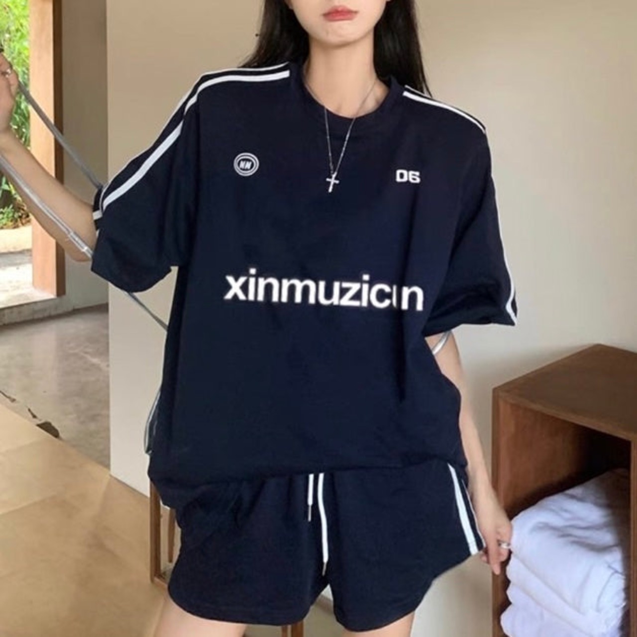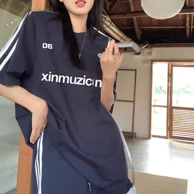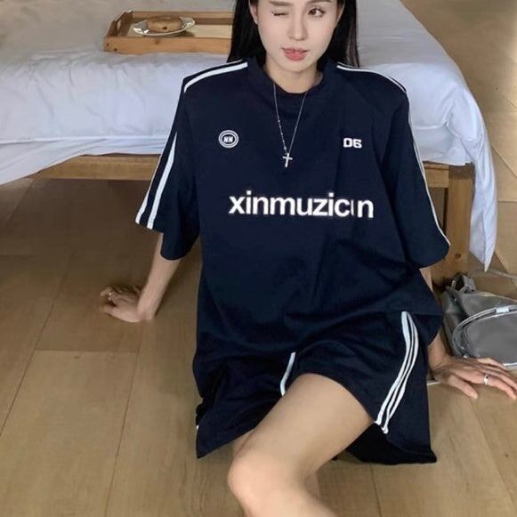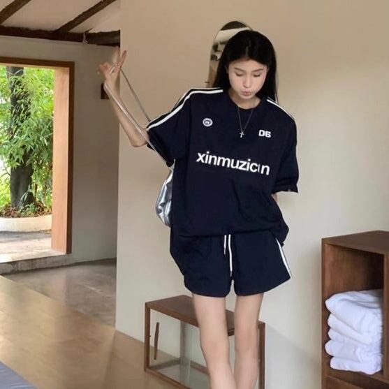 セットアップ ハーフパンツ レディース 韓国 ファッション Tシャツ 袖ライン ショートパンツ オーバーサイズ ラウンジ 2点上下セット