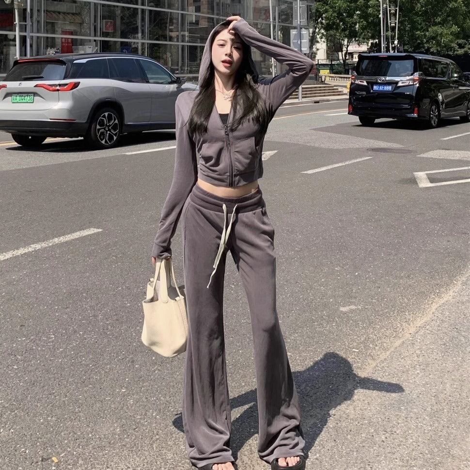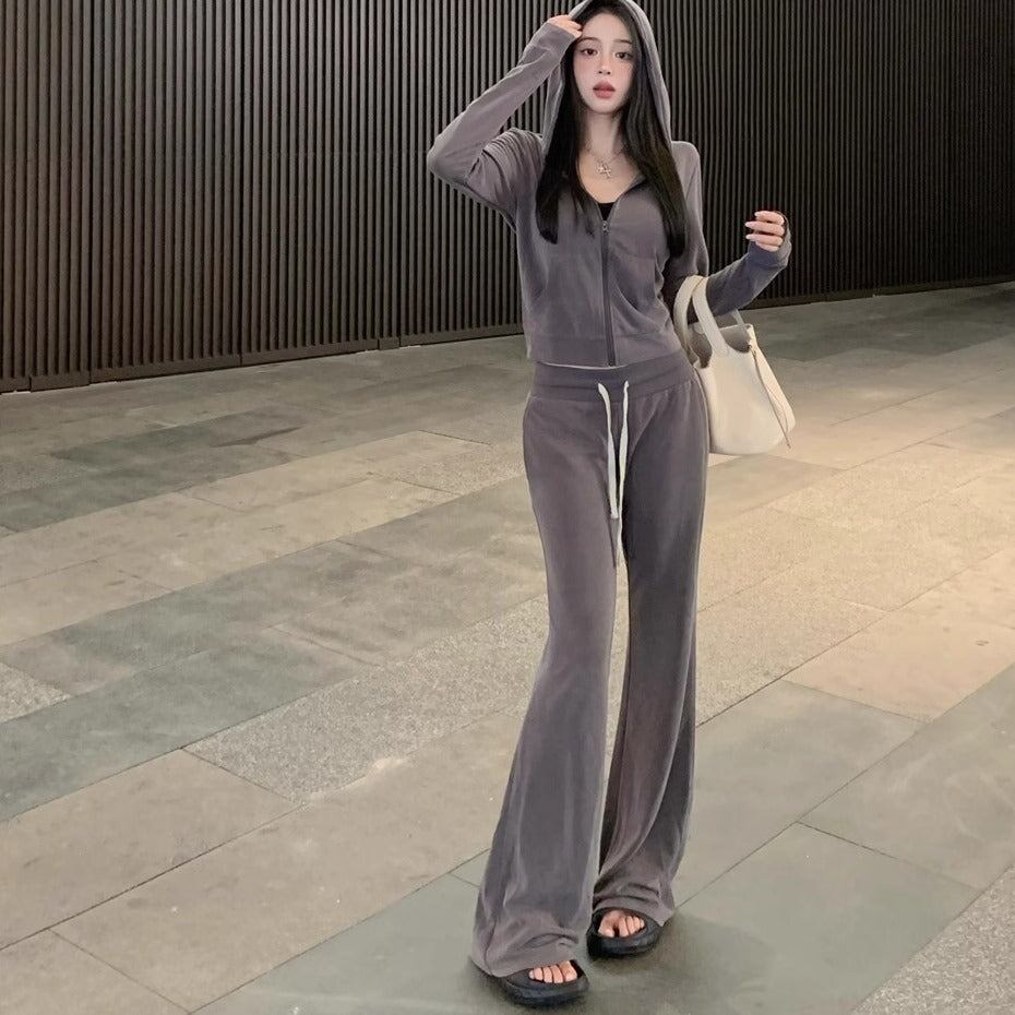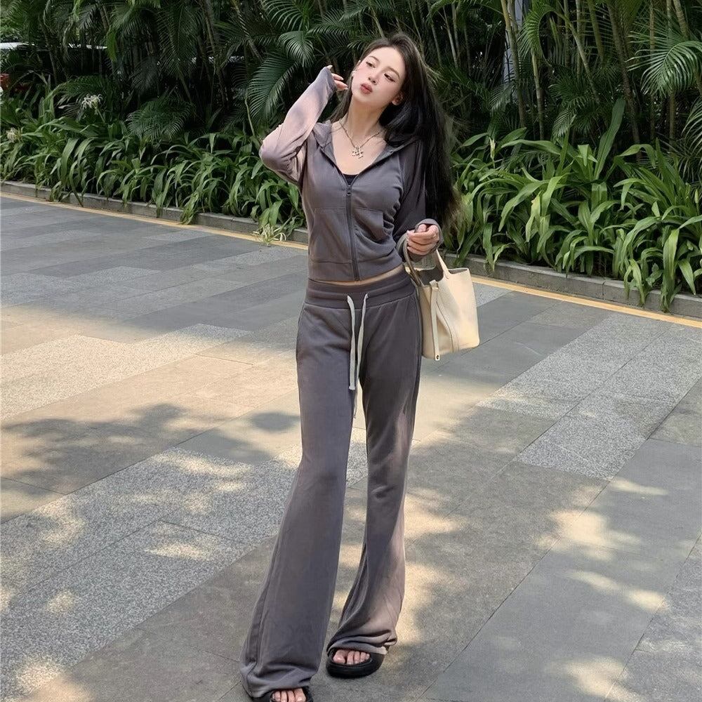 セットアップ レディース 韓国 スウェット クロップド パーカー フレアパンツ 上下 2点 セット ジップアップパーカー グレー ニュアンスカラー