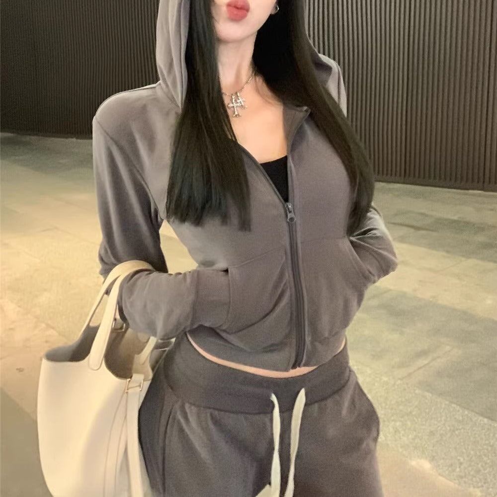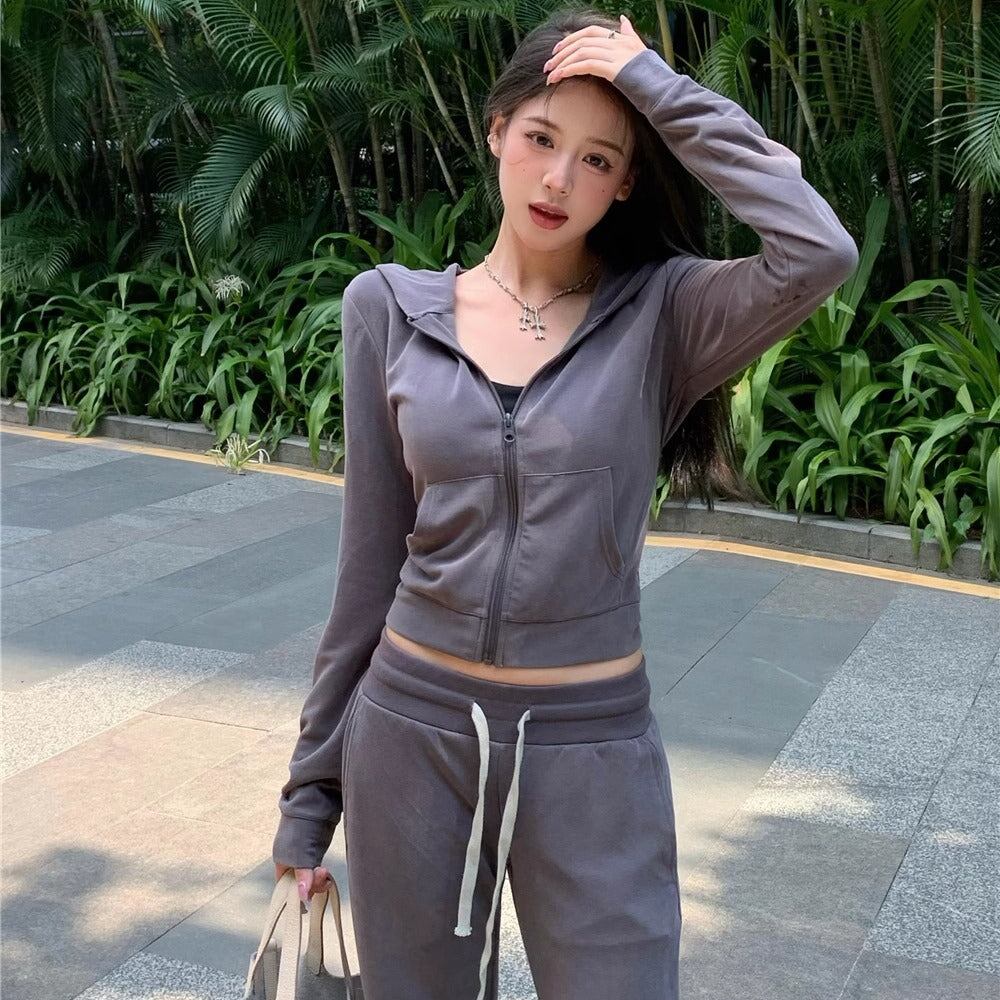 クロップトップ スウェット セットアップ レディース 韓国 ファッション 上下2点セット ジップパーカー ジップパーカー グレー ニュアンスカラー ロングパンツ ショート丈