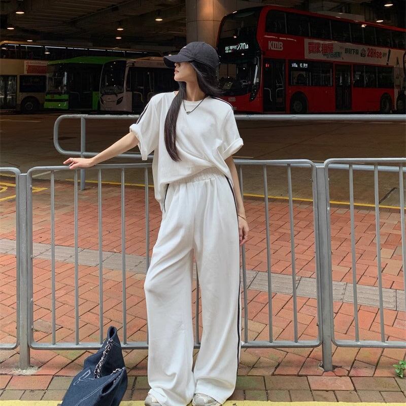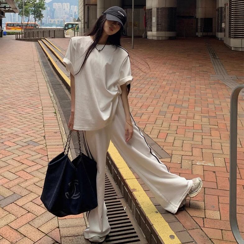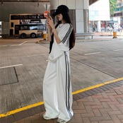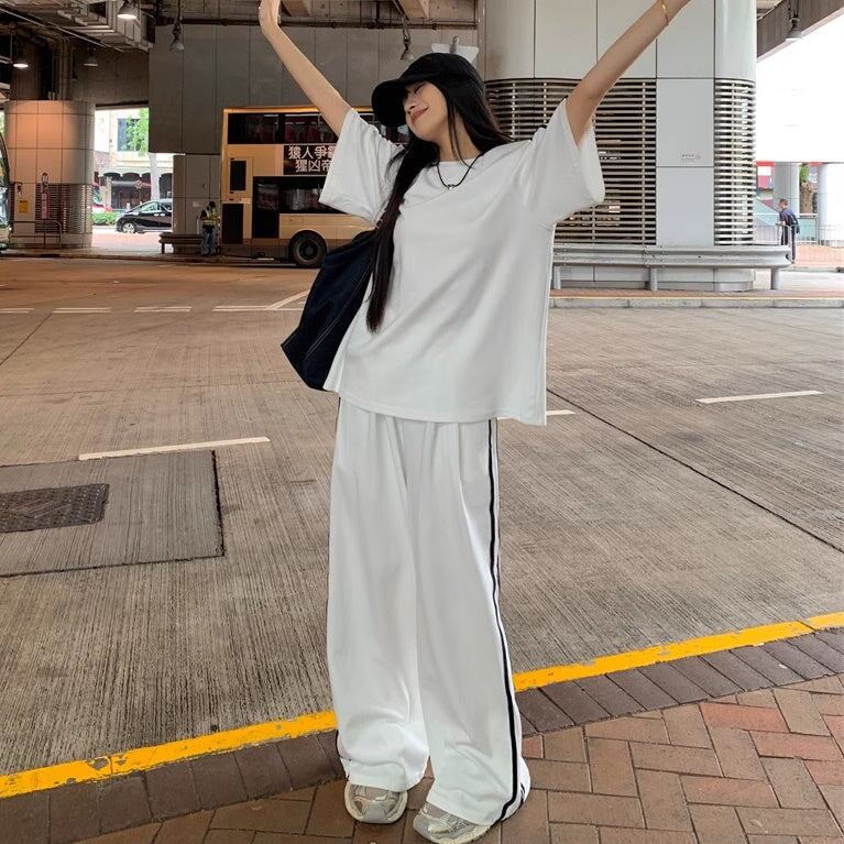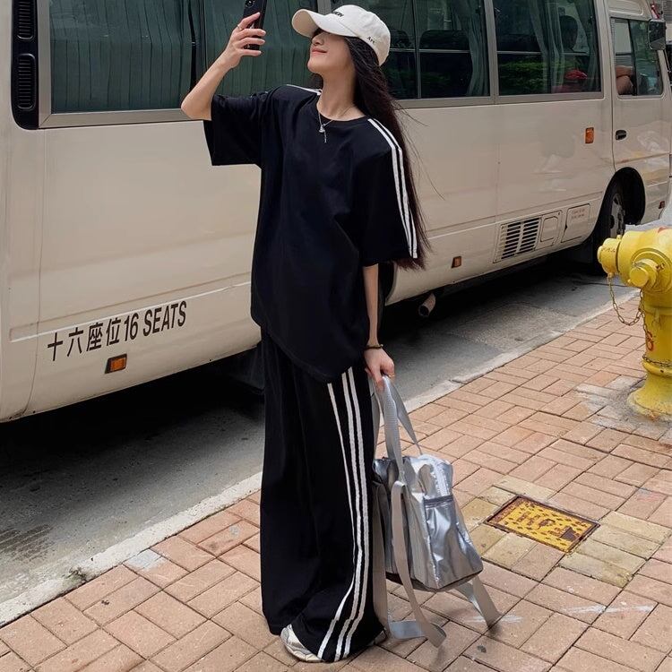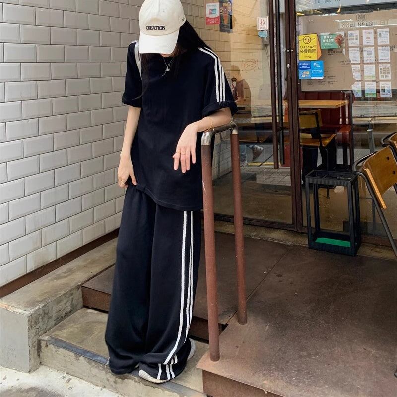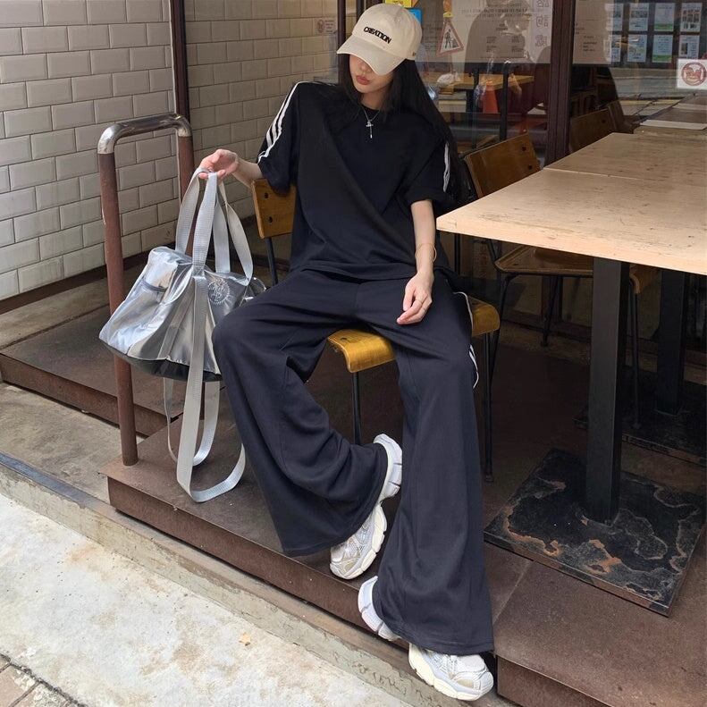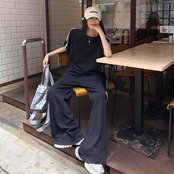 セットアップ レディース 韓国 ファッション サイドライン Tシャツ ワイドパンツ スポーティー 上下セット