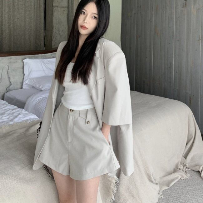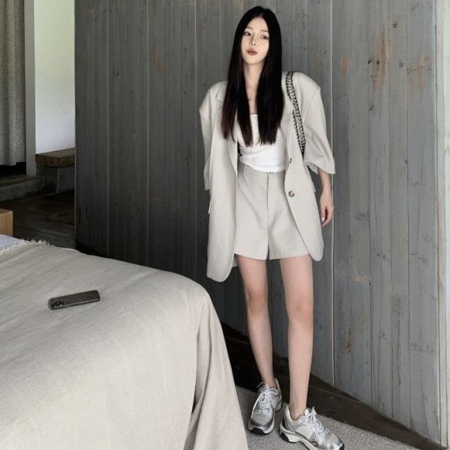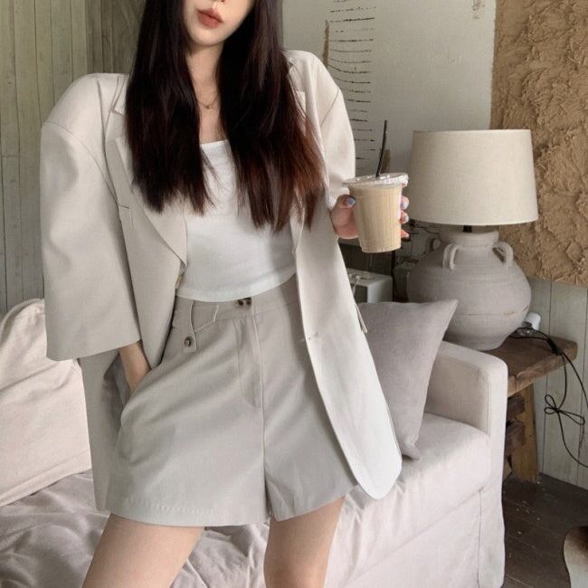 セットアップ レディース 韓国 半袖 ジャケット ショートパンツ 上下セット マニッシュ カジュアル きれいめ スーツ ビッグシルエット