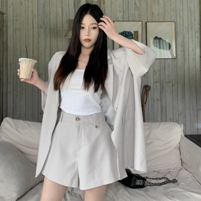セットアップ 半袖ジャケット ショートパンツ レディース 韓国 ファッション マニッシュ お呼ばれ スーツ ビッグシルエット