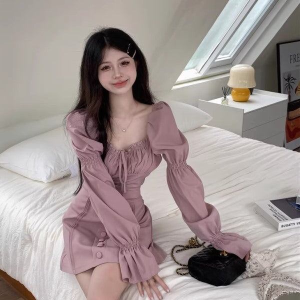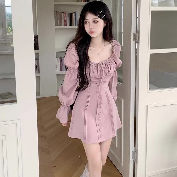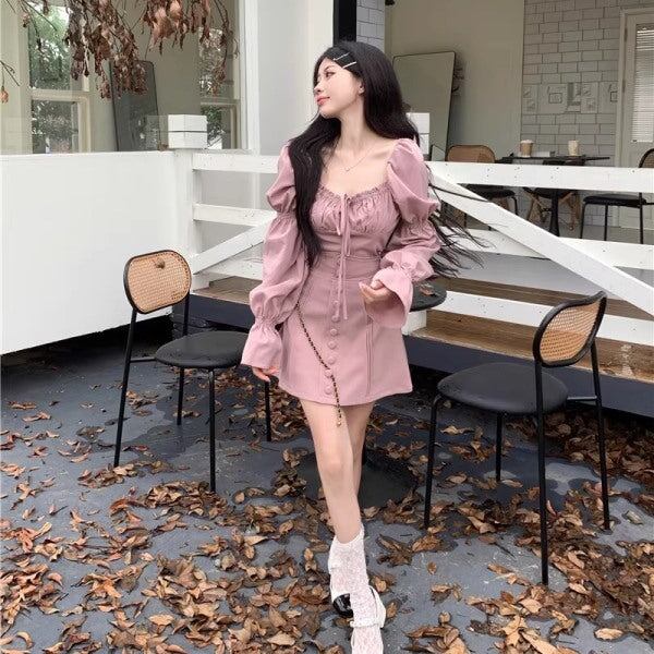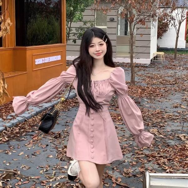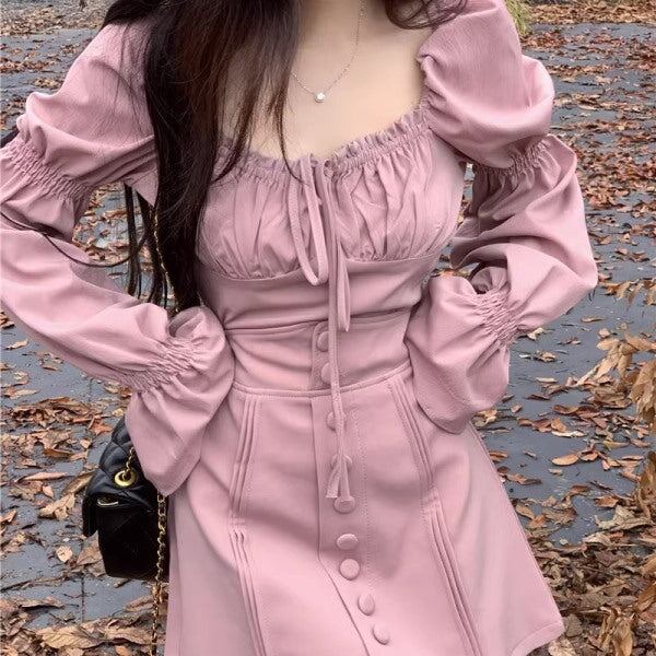セットアップ ワンピ レディース パフスリーブ クロップド トップス ミニスカート 上下セット 韓国 ファッション 長袖 バルーンスリーブ ピンク ガーリー ワンピース風 セットアップ