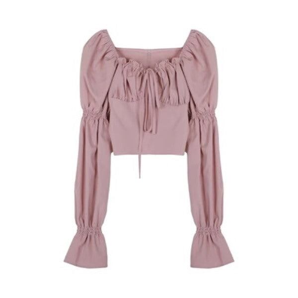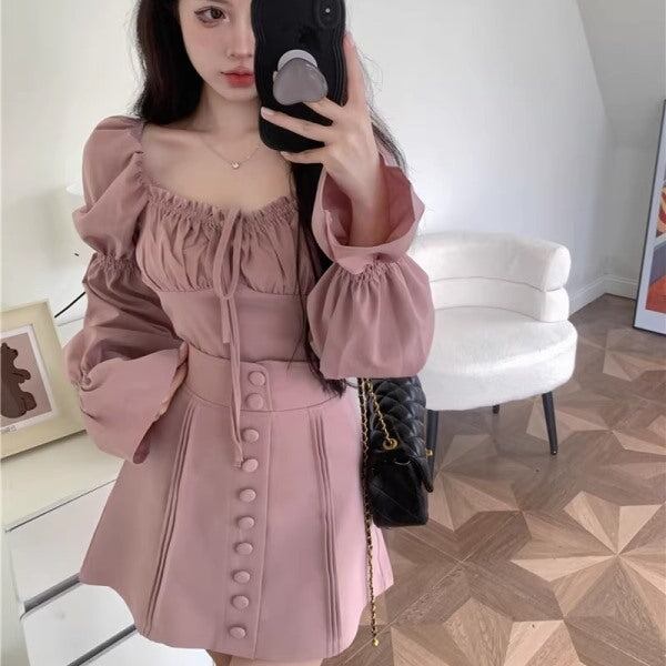 セットアップ クロップトップ ミニスカート レディース 韓国 ファッション 台形スカート バルーンスリーブ ピンク ガーリー 上下 長袖 デコルテ