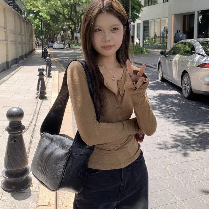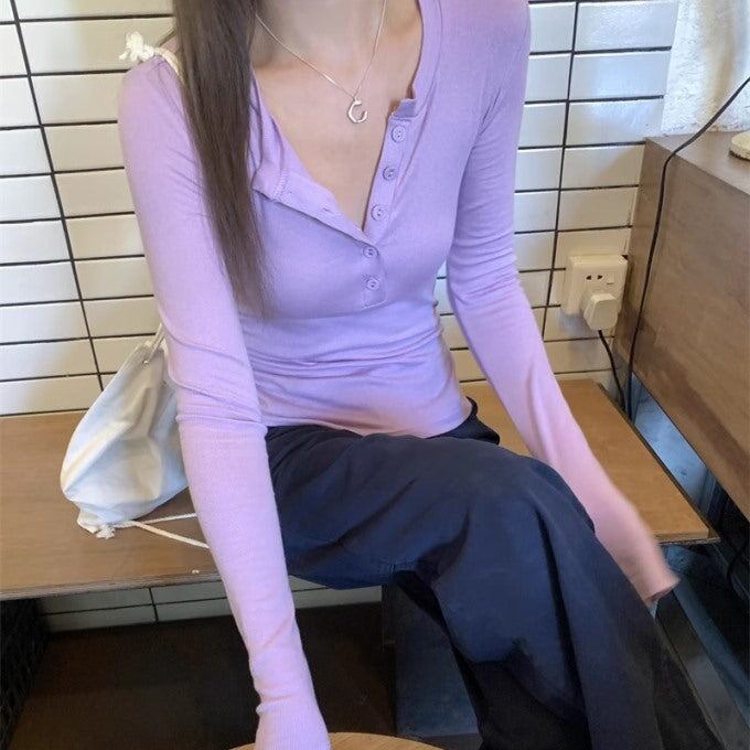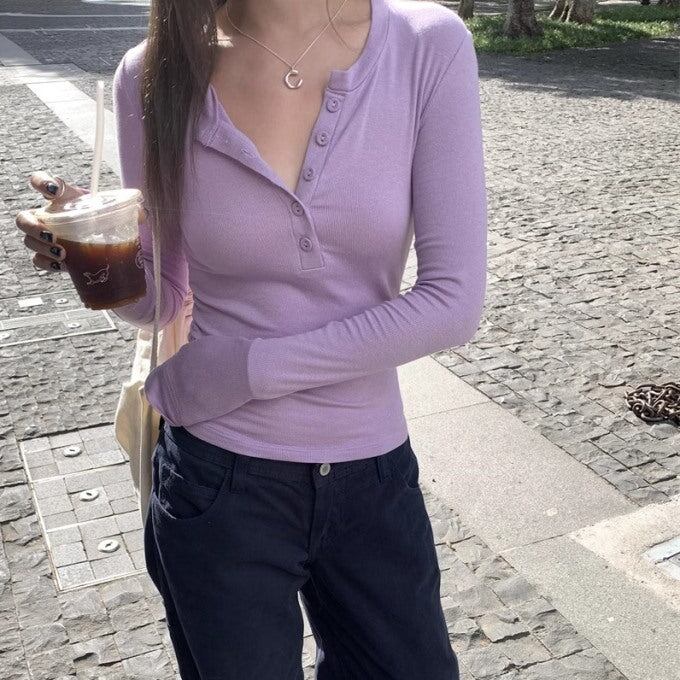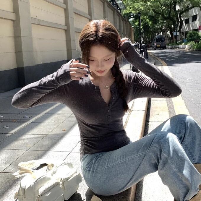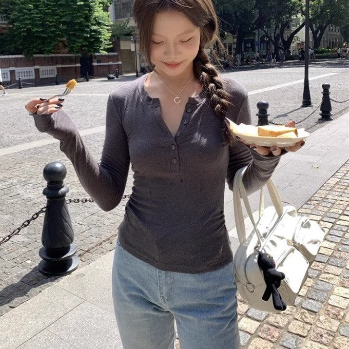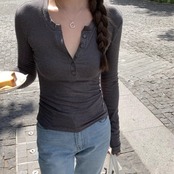 タイト リブカットソー ハーフボタン 長袖 レディース 韓国 ファッション ロンT タイトフィット トップス