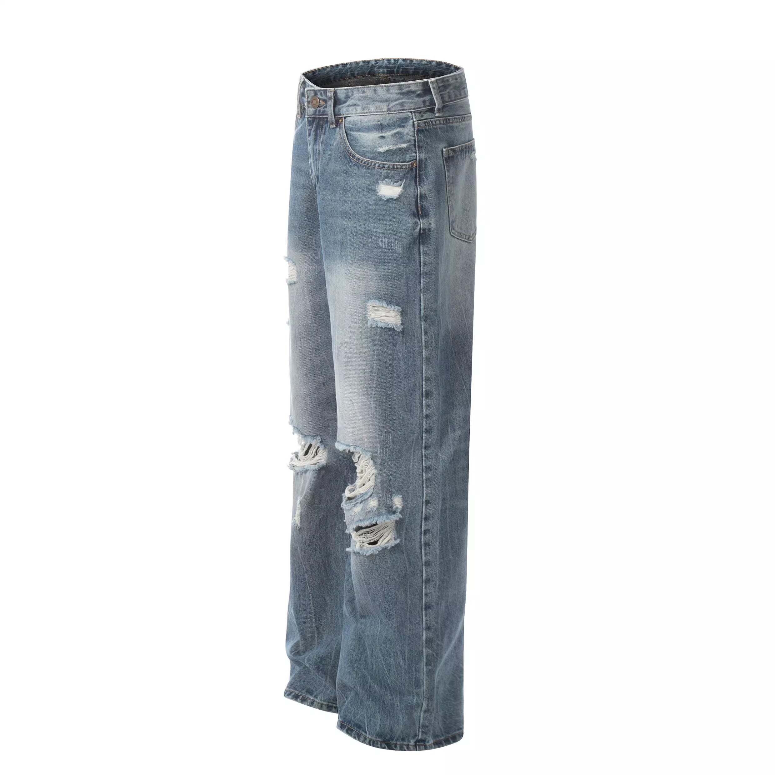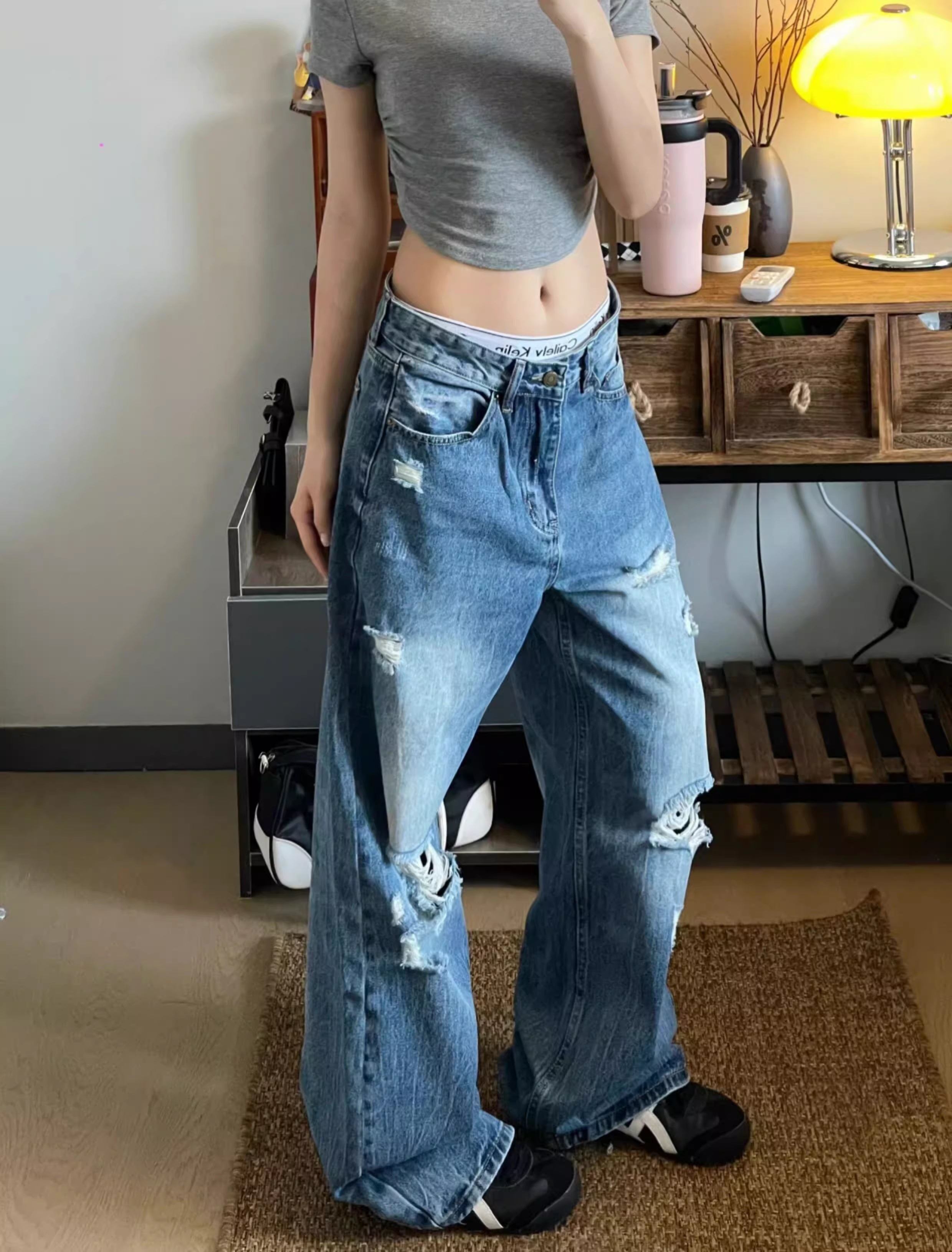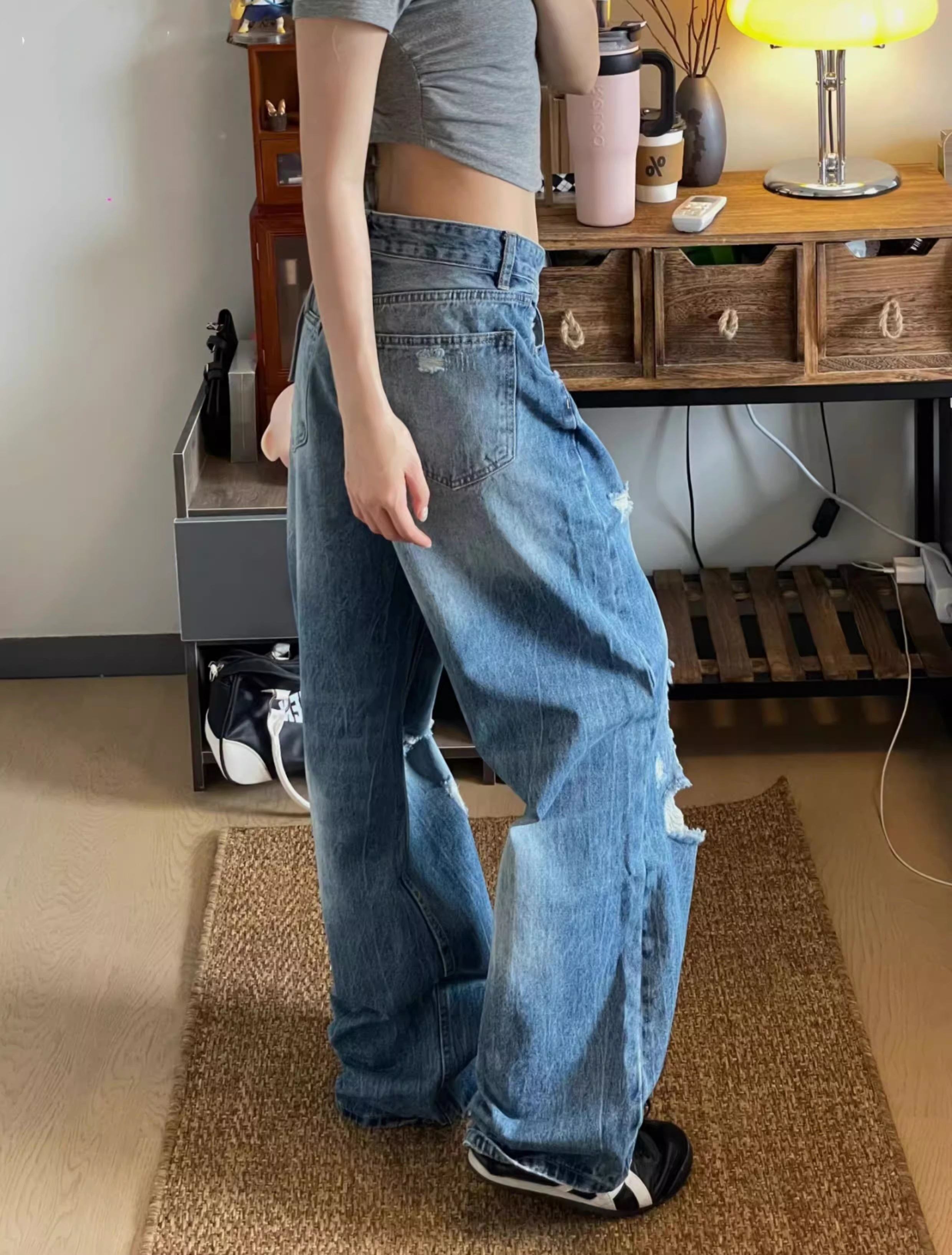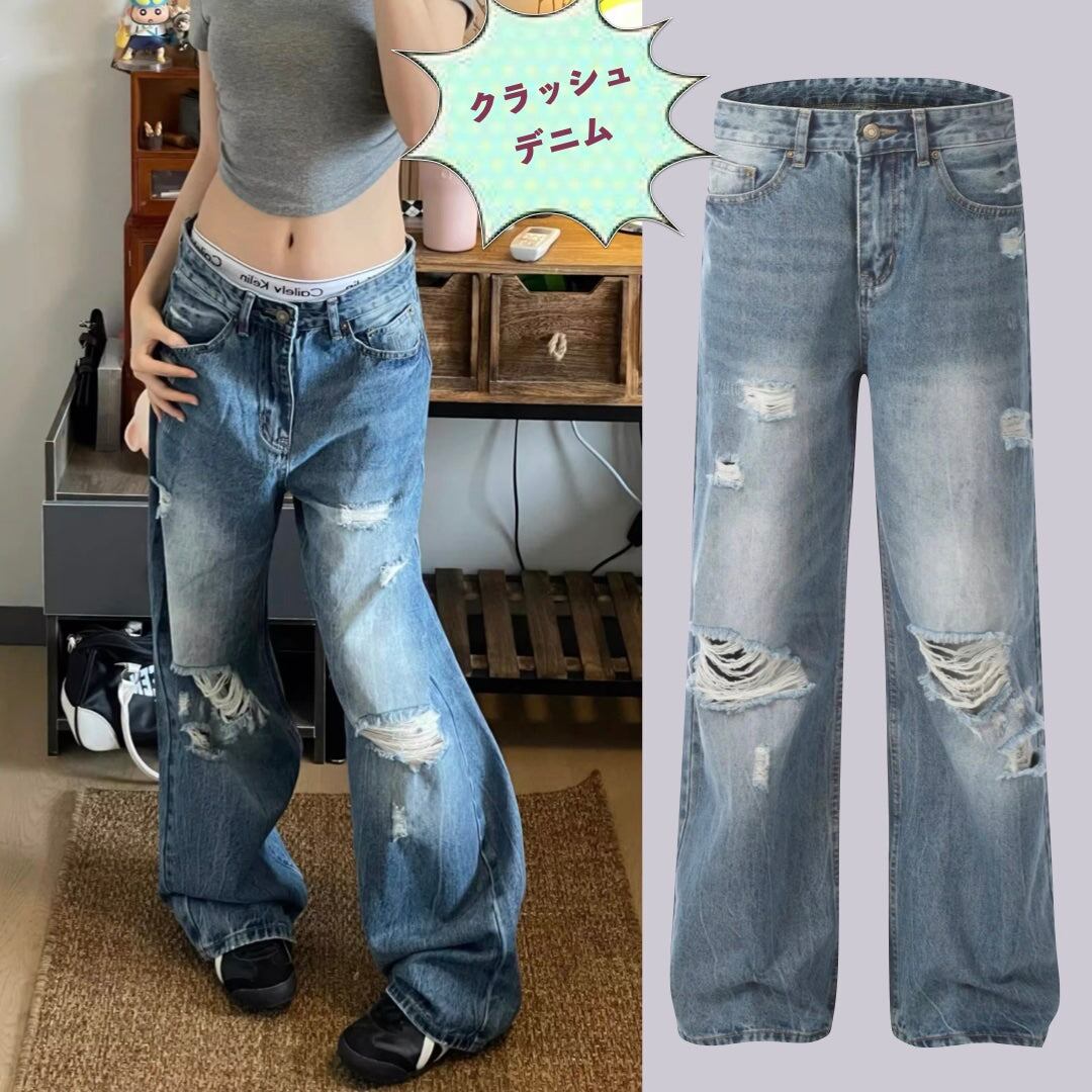 ダメージ デニムパンツ レディース 韓国 ファッション クラッシュ リップド ジーンズ ストレート