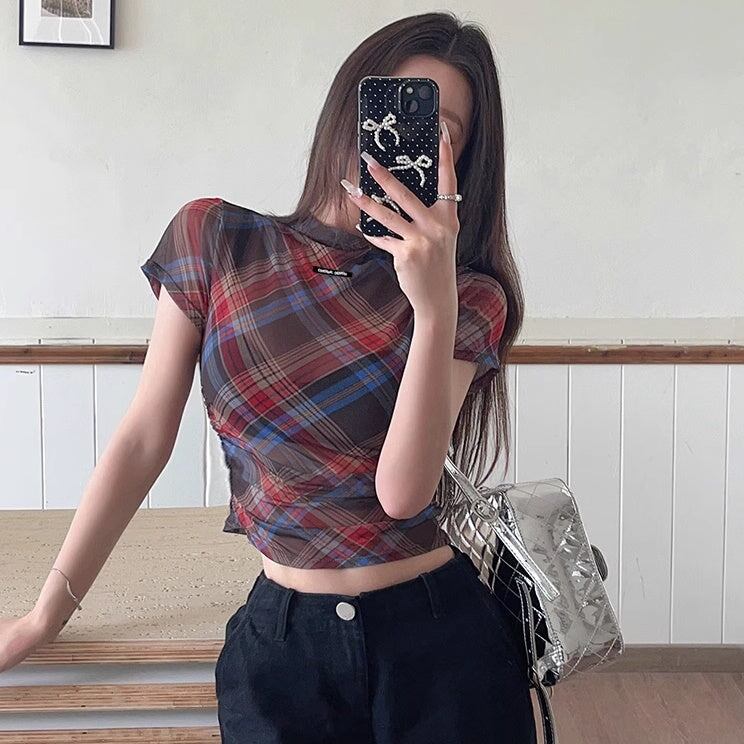 チェック シアー Tシャツ レディース 韓国 ファッション 透け感 レイヤード クロップド丈 モックネック 夏 トップス