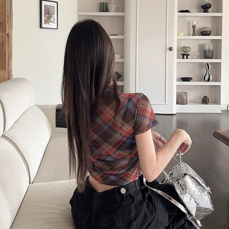 シアートップス Tシャツ レディース 韓国 ファッション 透け感 レイヤード クロップトップ チェック柄 かわいい おしゃれ モックネック 半袖