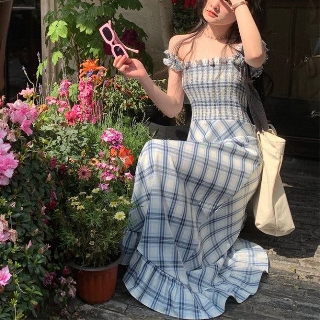 オフショルワンピース レディース 韓国 ファッション フリル ロングフレア チェック柄 フリルショルダー チューブワンピース Aライン レトロ おしゃれ