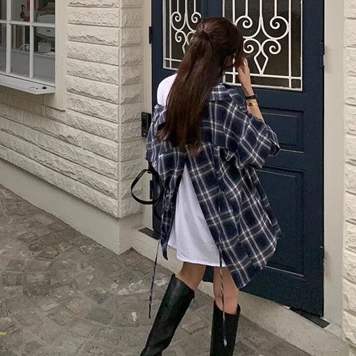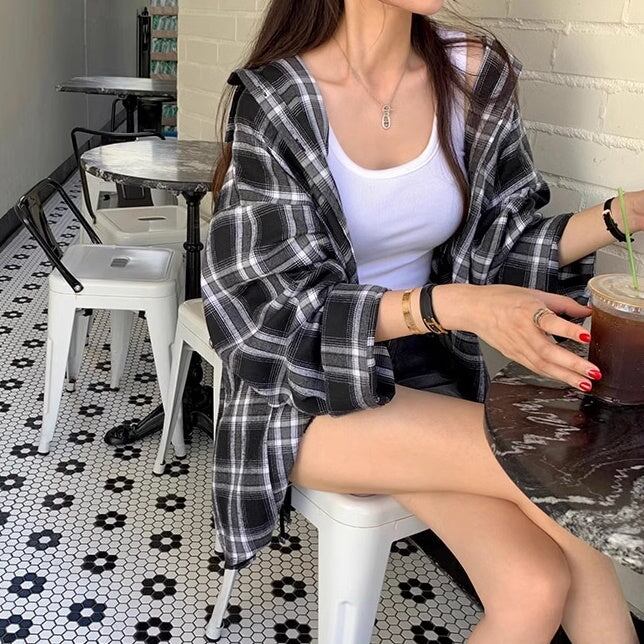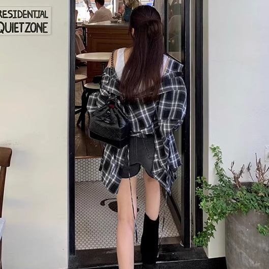 チェックシャツ オーバーサイズ レディース 韓国 ファッション 抜き襟 ビッグシルエット 柄シャツ かわいい