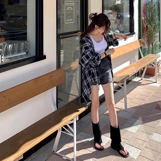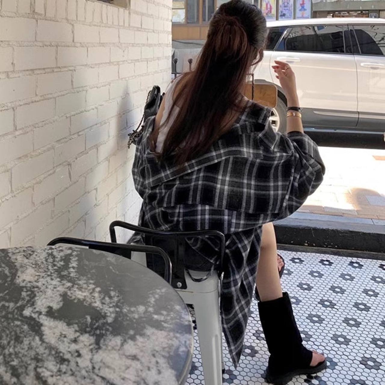チェックシャツ レディース ビッグシルエット 韓国 ファッション 抜き襟 スリット バックシャン シャツ 羽織り トップス