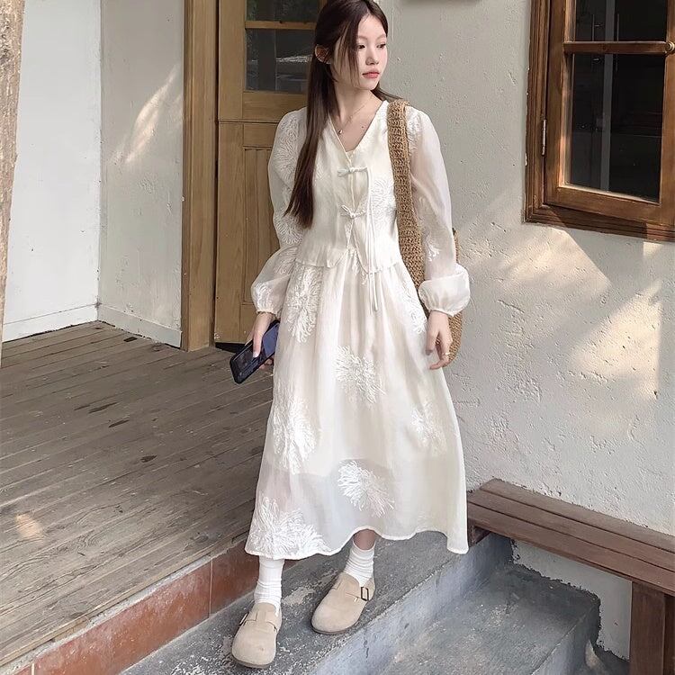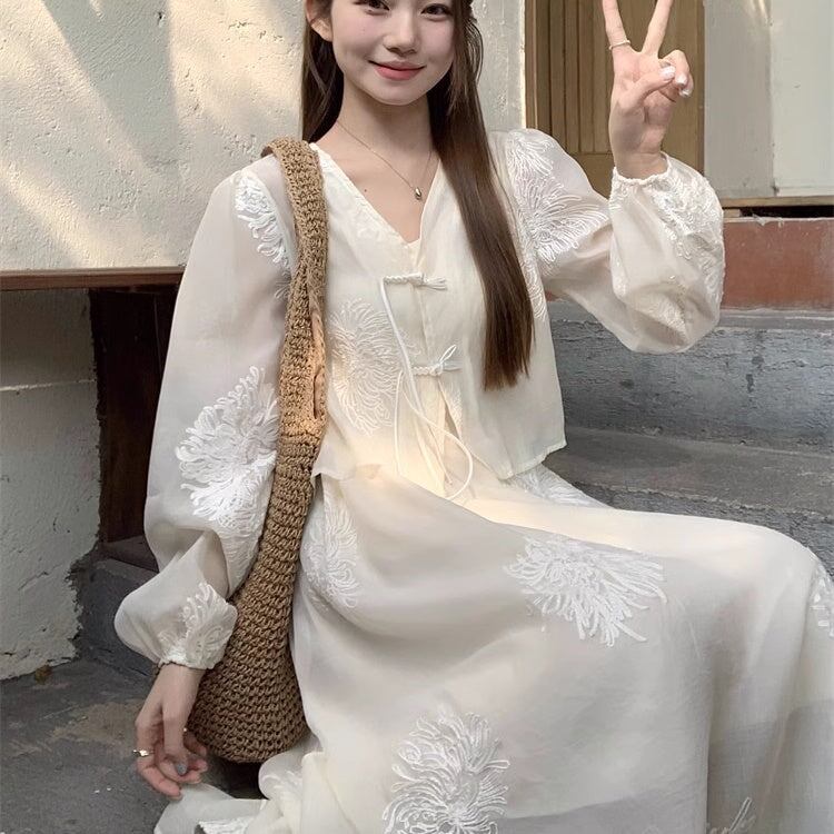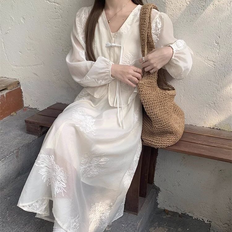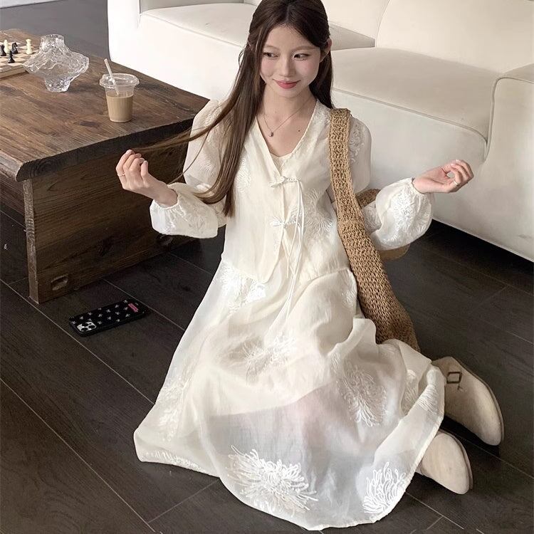 チャイナドレス セット レディース 韓国 ファッション キャミワンピース ボレロ 中国結び 2点セット 上下 かわいい 刺繍 白ドレス