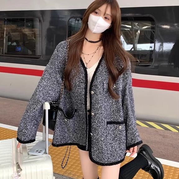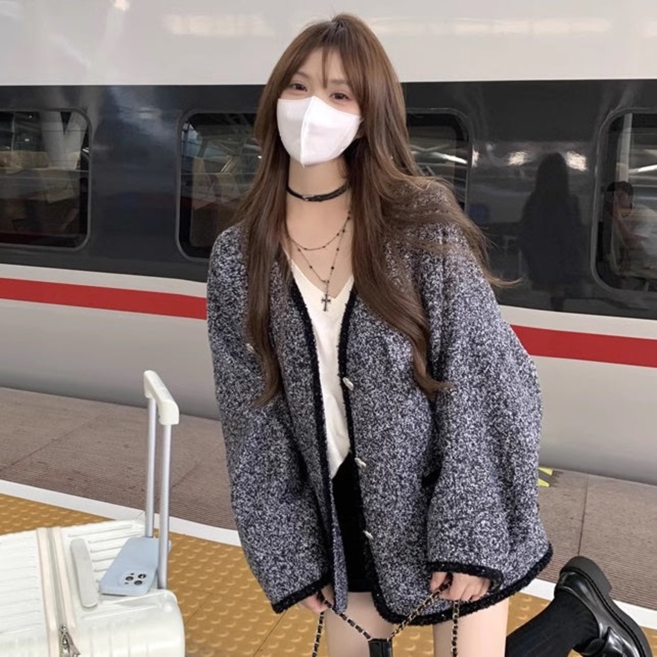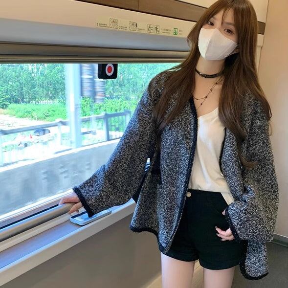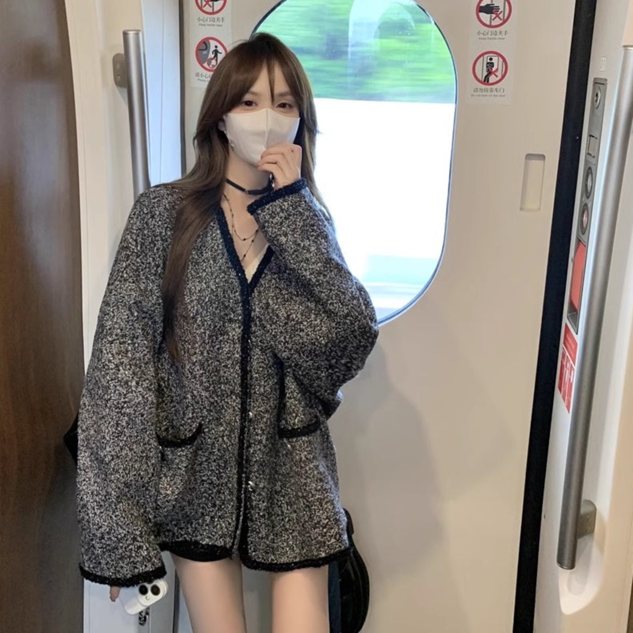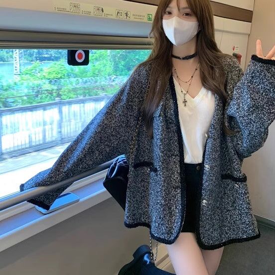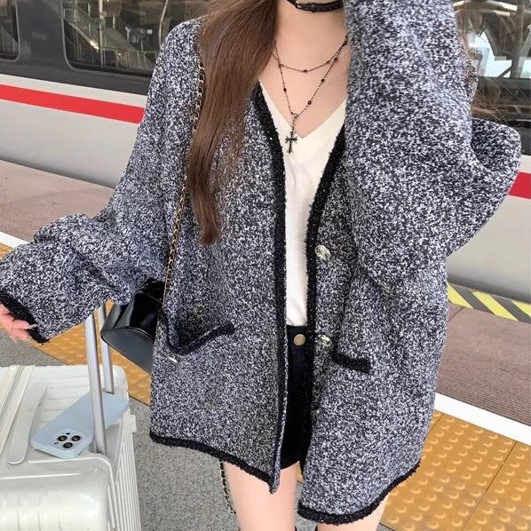 ツイードジャケット レディース 韓国 ファッション ニットアウター ミックスグレー 大人カジュアル ボタンアウター 冬 Vネック カーディガン