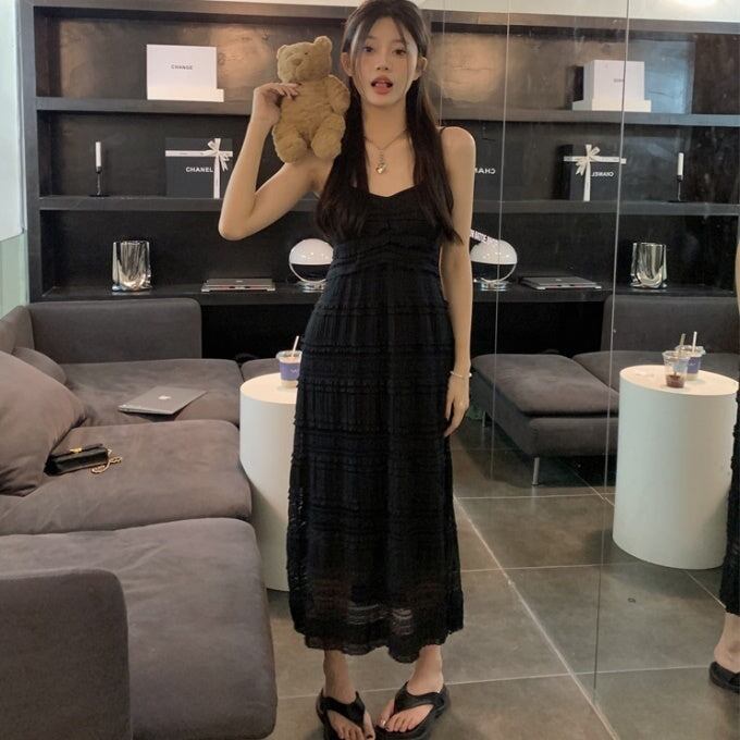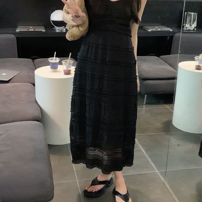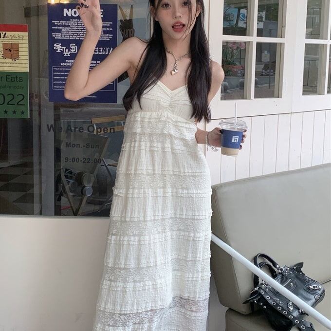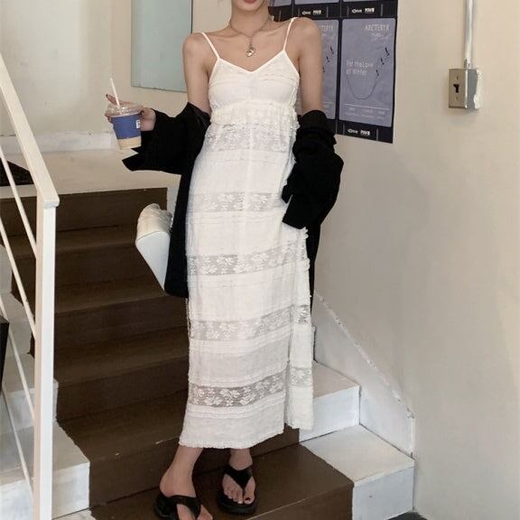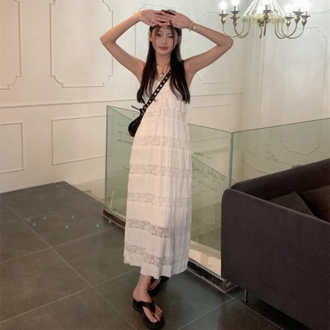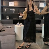 キャミワンピース ロングフレア レディース 韓国 ファッション レース 刺繍 ノースリーブ すけ感 エアリー サマードレス ロングマキシ
