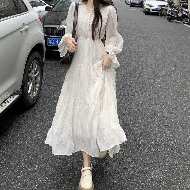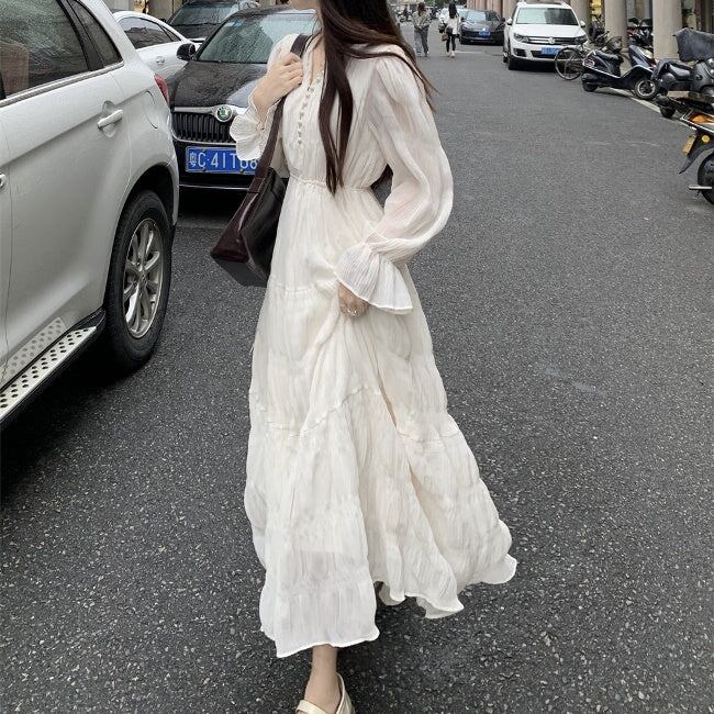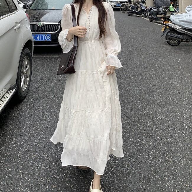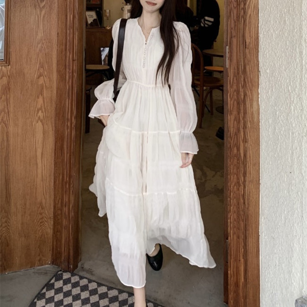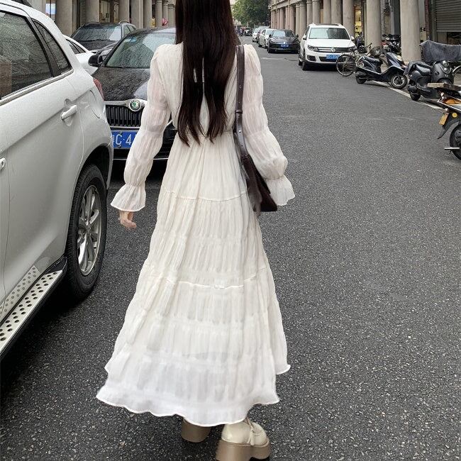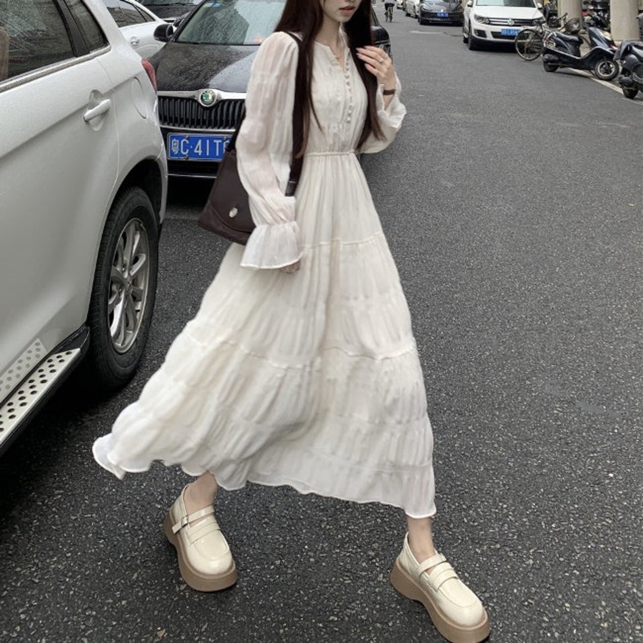 白ワンピース 長袖 ティアード レディース 韓国 ファッション マキシロング フェミニン チュール おしゃれ かわいい