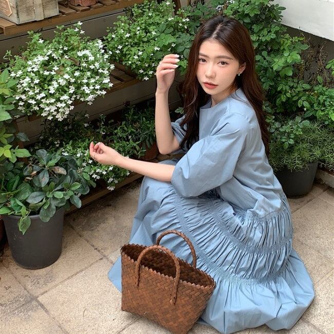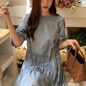 ワンピース シャーリング レディース 韓国 ファッション 切り替え ウエスト 半袖 ハーフスリーブ ガーリー フェミニン かわいい