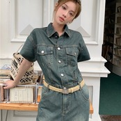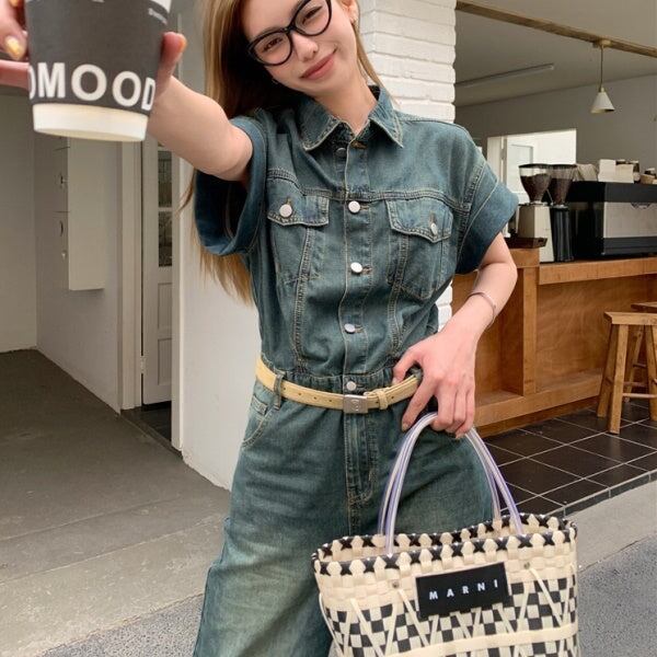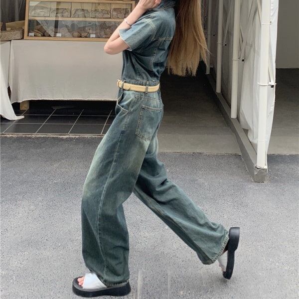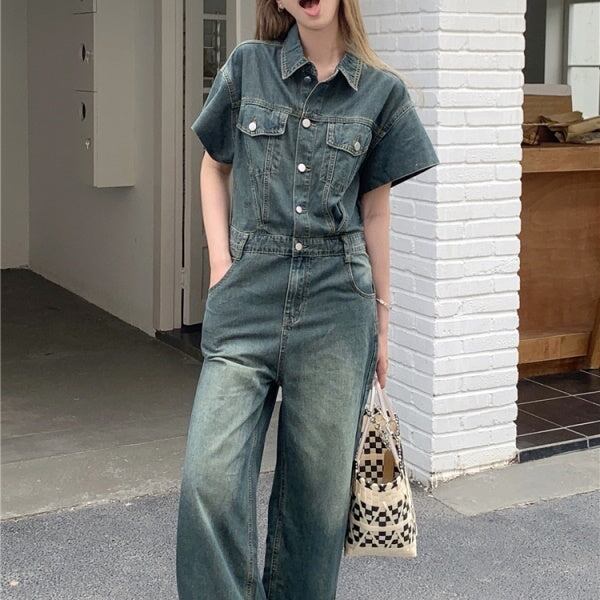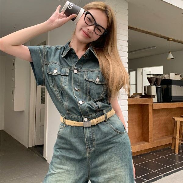 ジャンプスーツ デニム レディース 韓国 ファッション オールインワン デニムパンツ デニムシャツ 半袖 タンガリー 夏