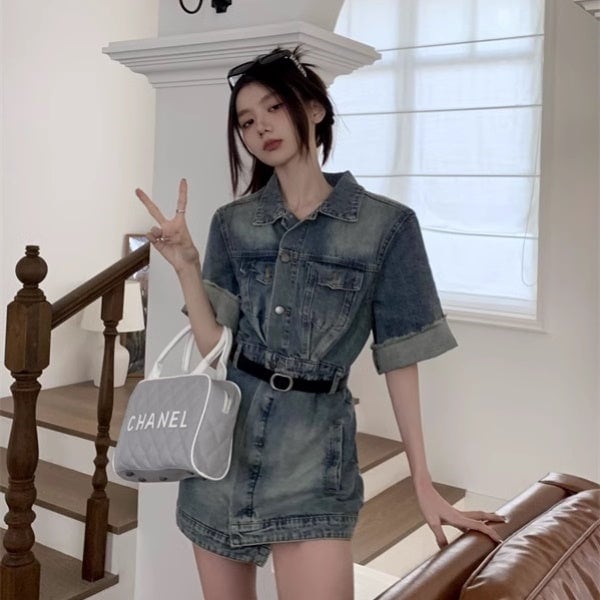 デニム オーバーオール レディース ミニワンピ 韓国 デニム シャツ ワンピース 夏 半袖 レトロ かわいい ダメージ加工