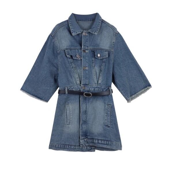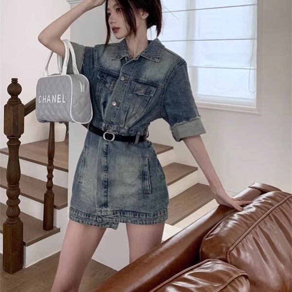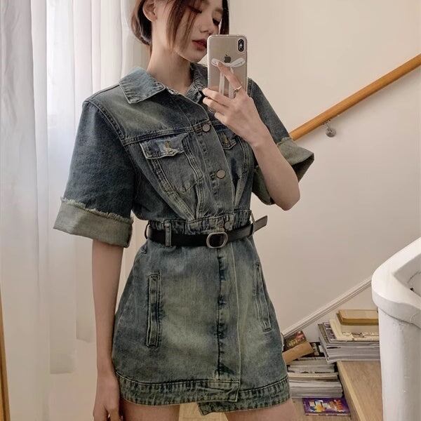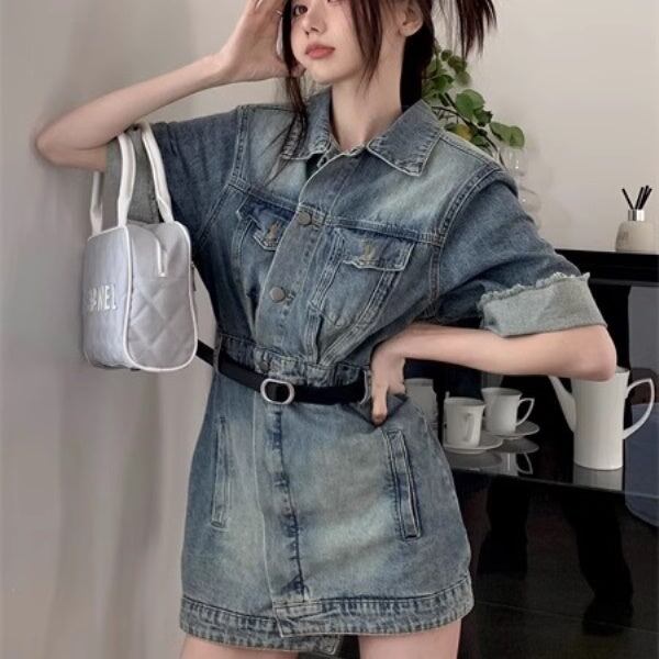 デニムワンピース レディース 韓国 ファッション シャツワンピース ミニワンピ デニム 夏 半袖 レトロ かわいい ダメージ加工