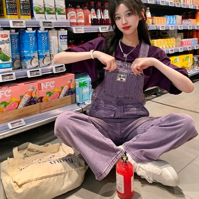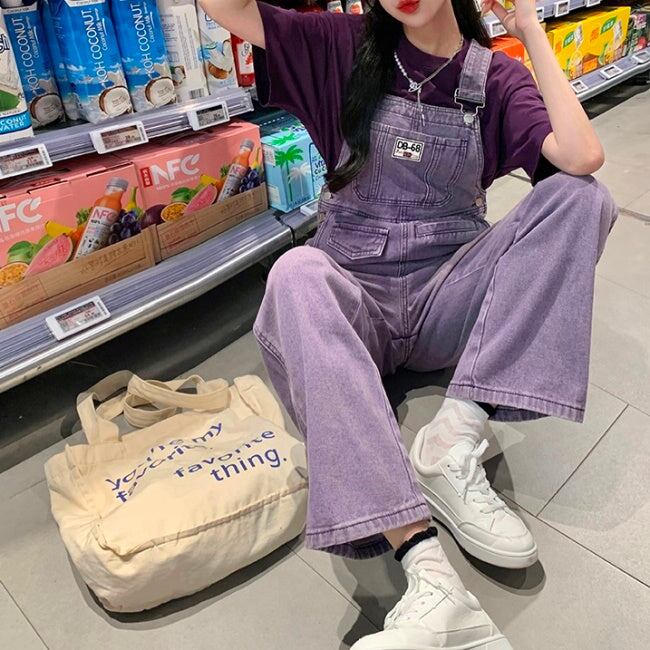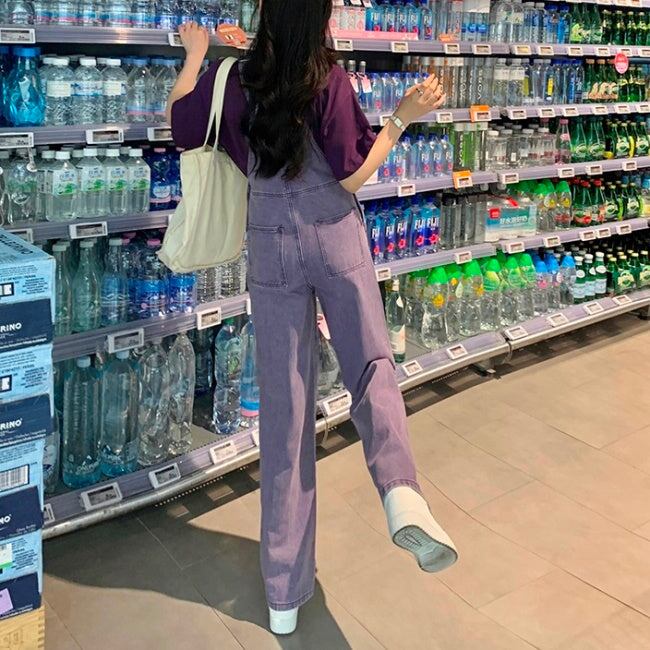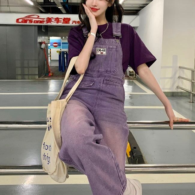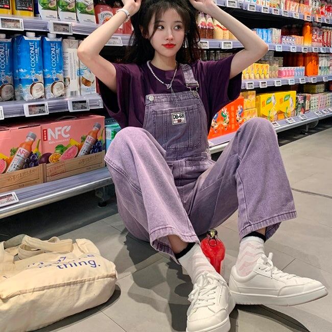 デニム オーバーオール レディース 韓国 パープル ユーズド加工 デニム サロペットパンツ 夏