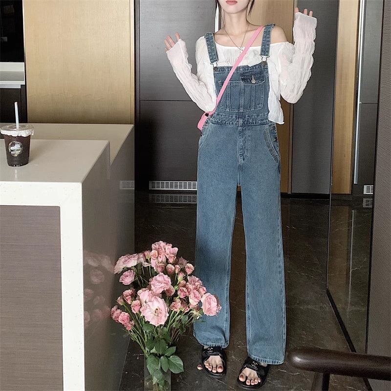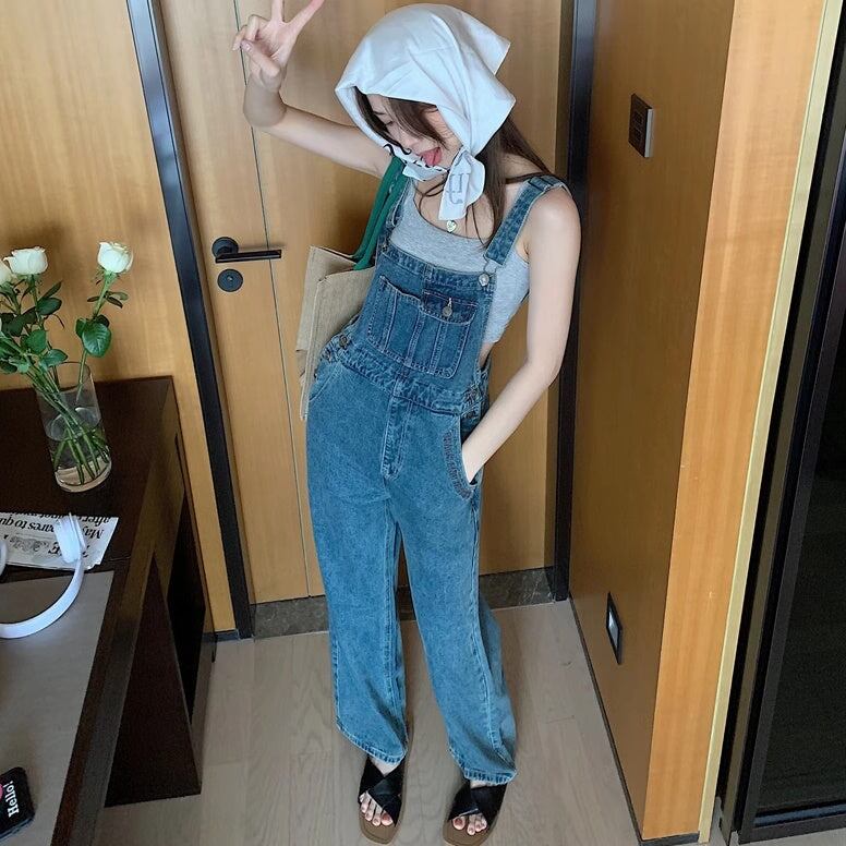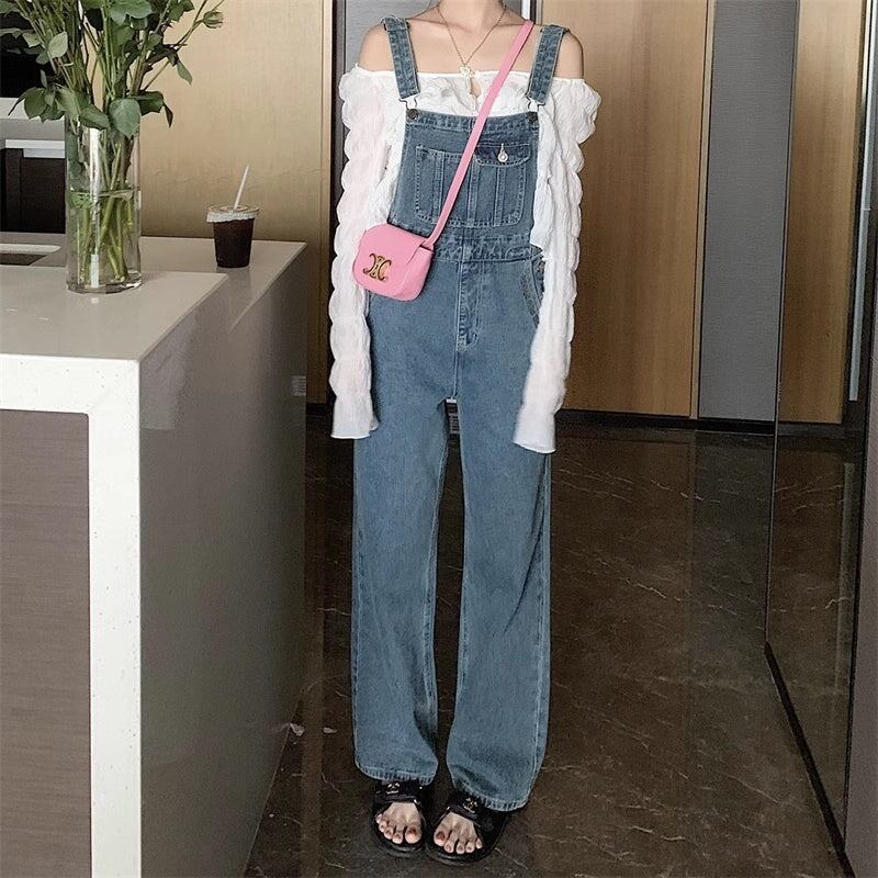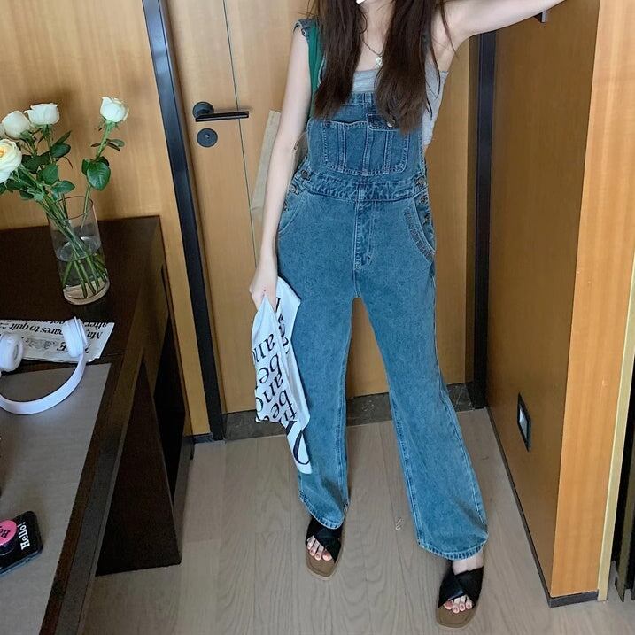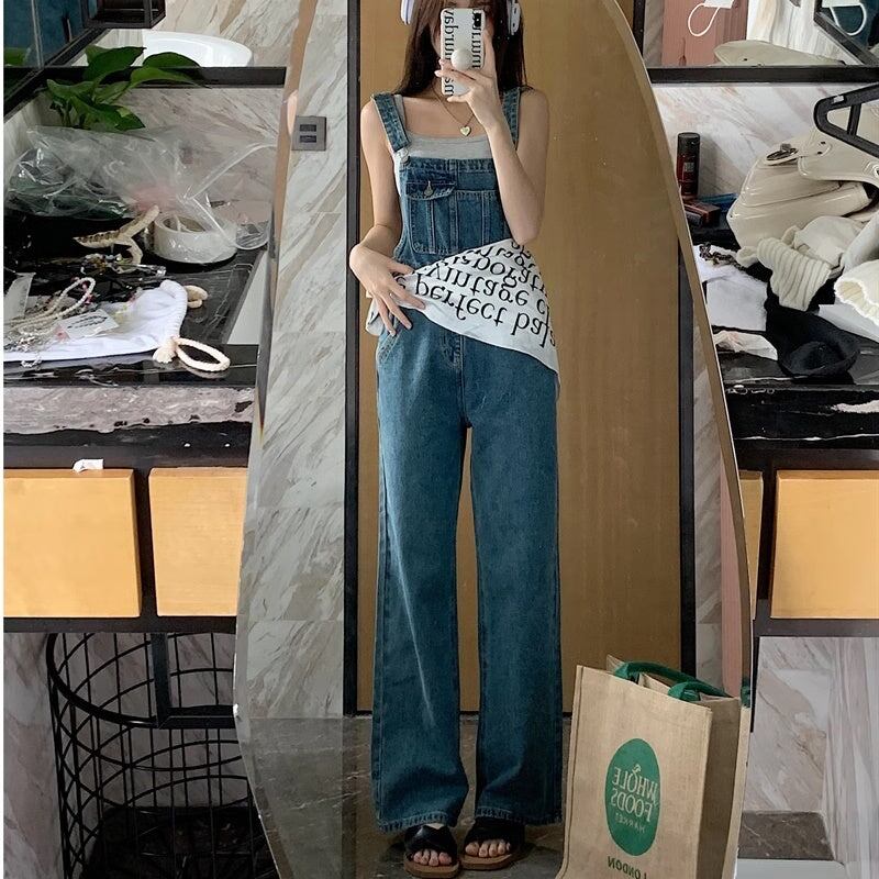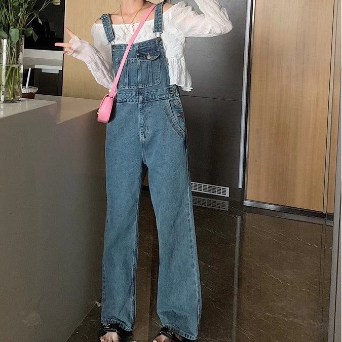 デニム オーバーオール レディース 韓国 ファッション サロペットパンツ オールインワン ヴィンテージ加工 ブルーデニム