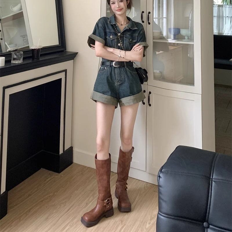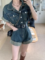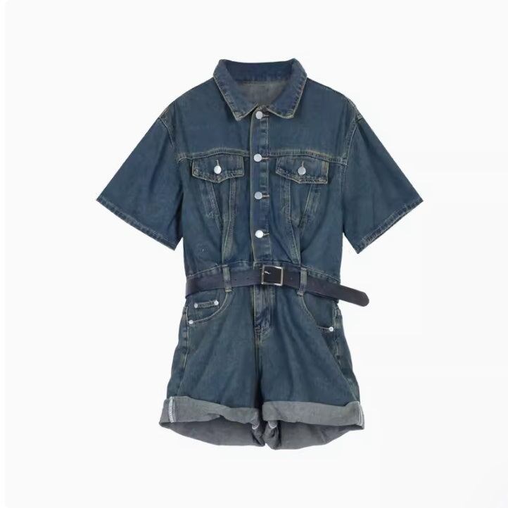 デニム オールイワン レディース 韓国 ファッション ウエストベルト 半袖 ハーフパンツ シャツ サロペット ショートパンツ ブルーデニム インディゴ メタルボタン 厚コーデ