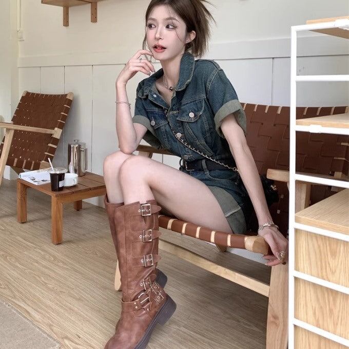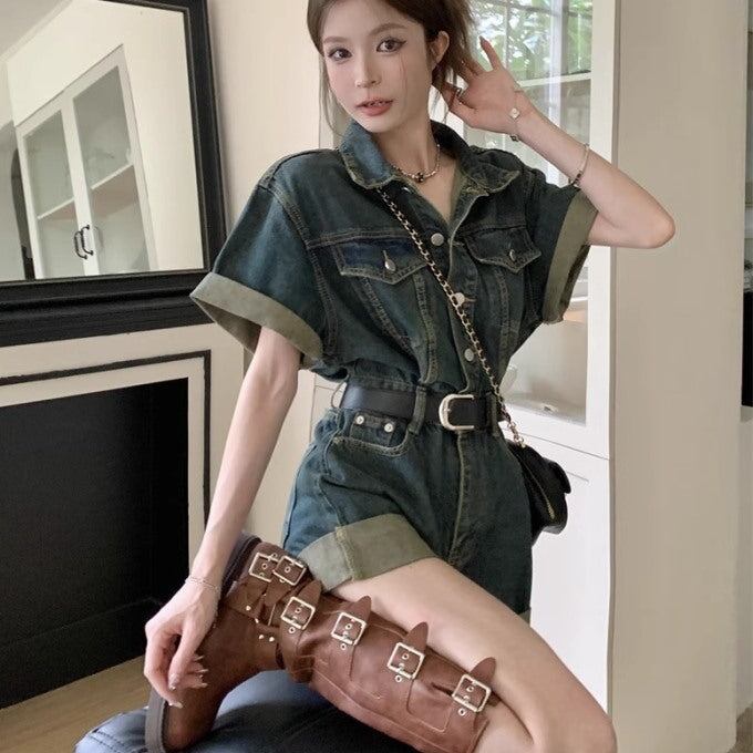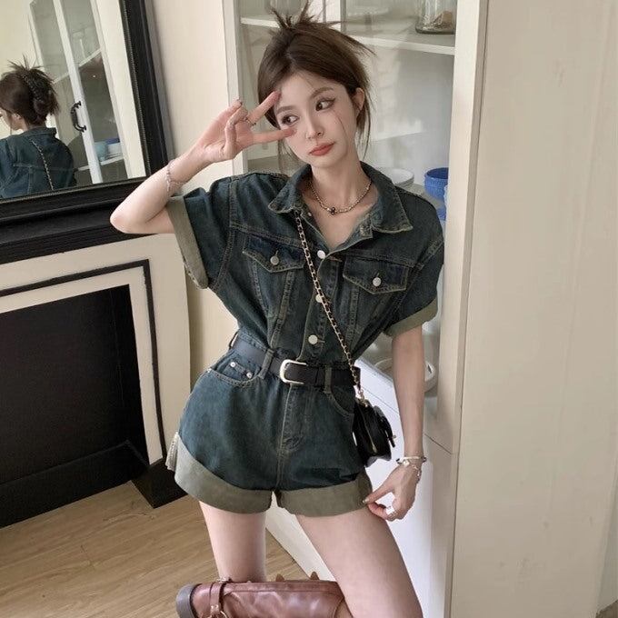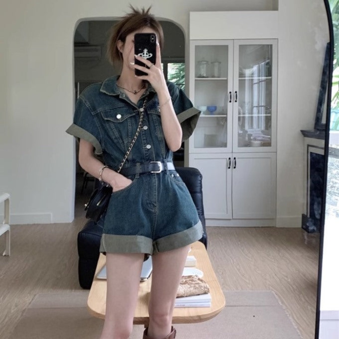 デニム オールインワン レディース 韓国 ファッション 半袖ショートパンツ デニムシャツ ショーパン ダークデニム ジャンプスーツ