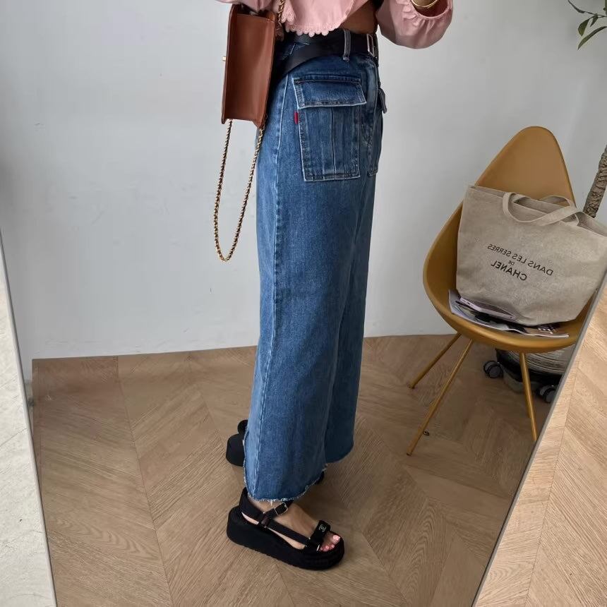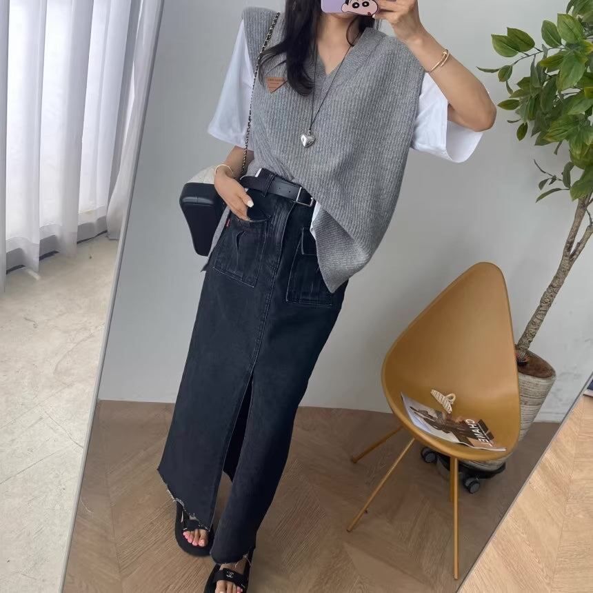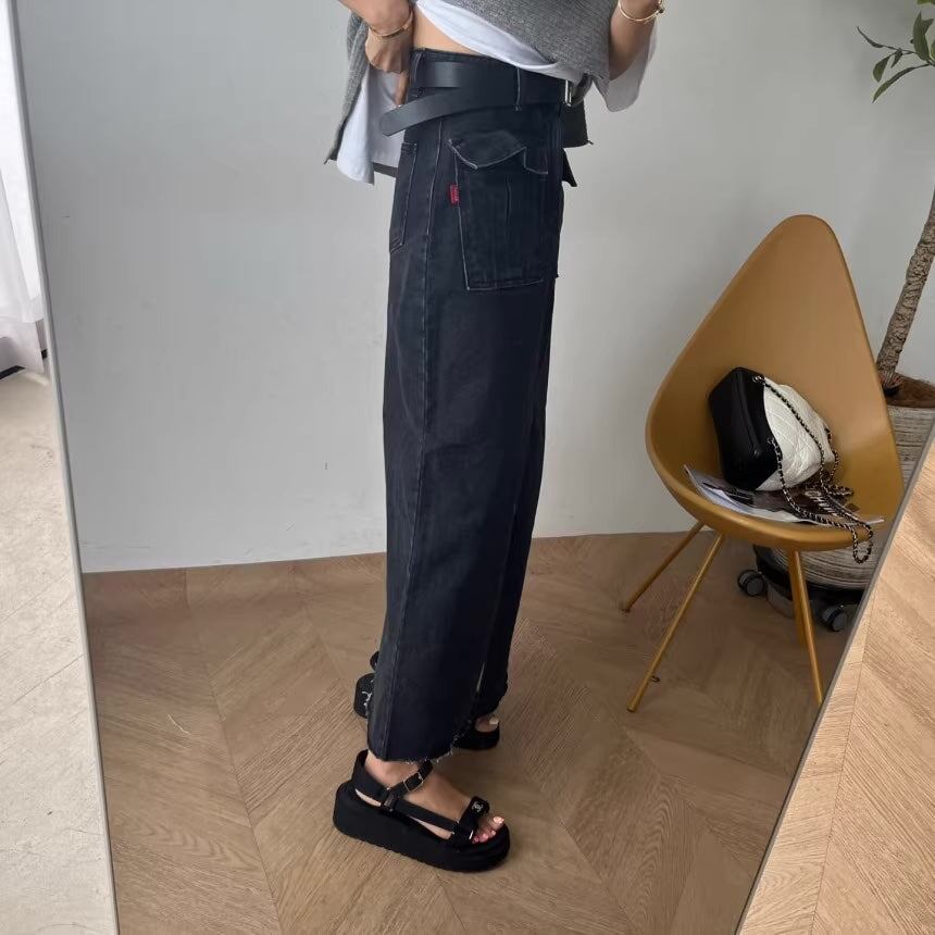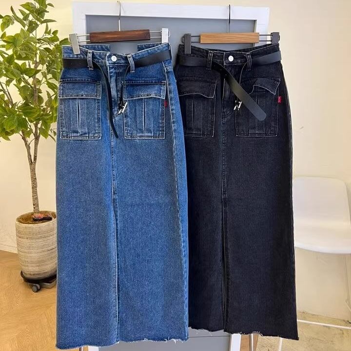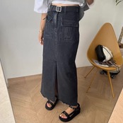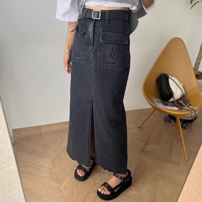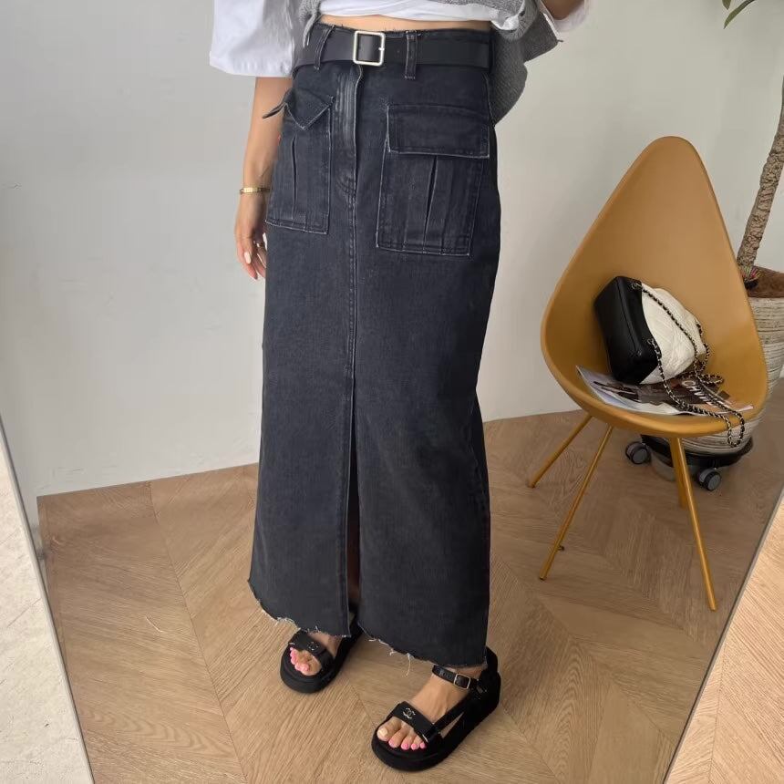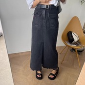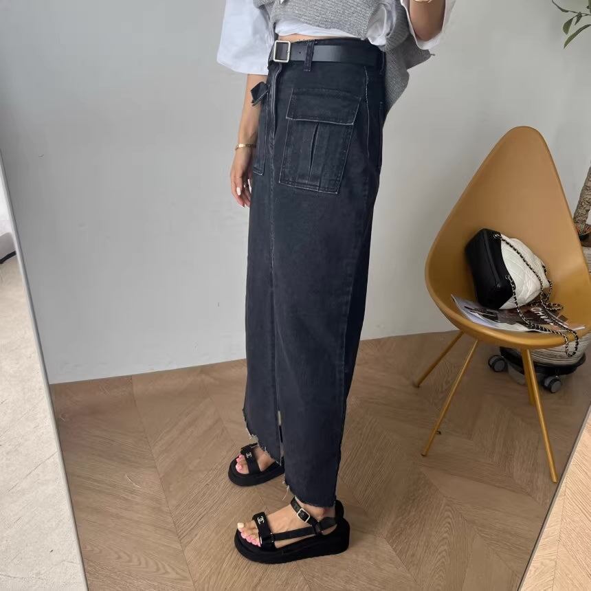 デニム カーゴ スカート レディース 韓国 ファッション ポケット ナロースカート タイト フロントスリット カジュアル ロングスカート