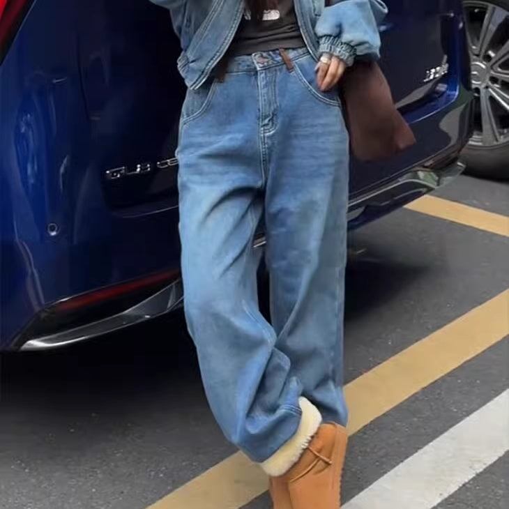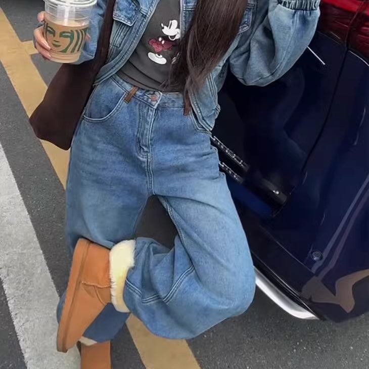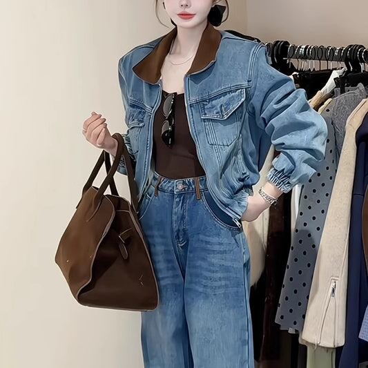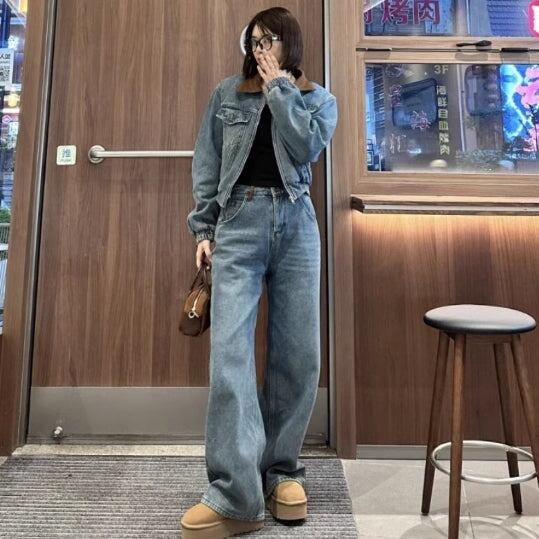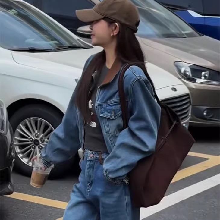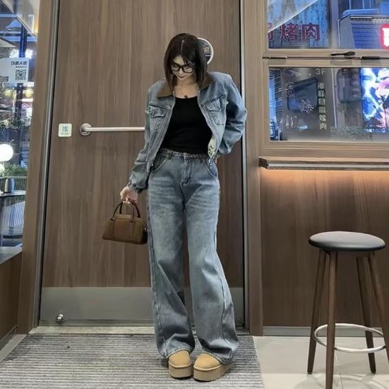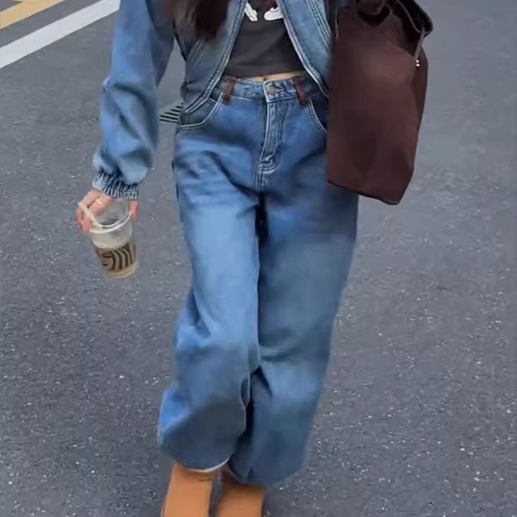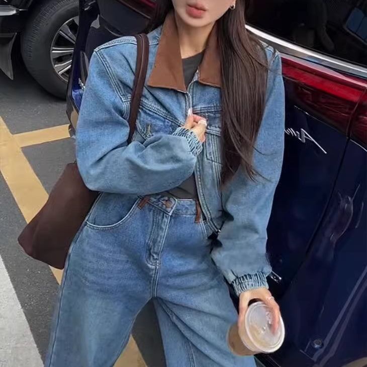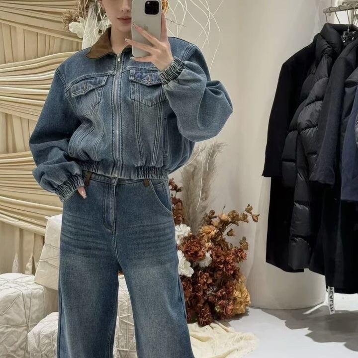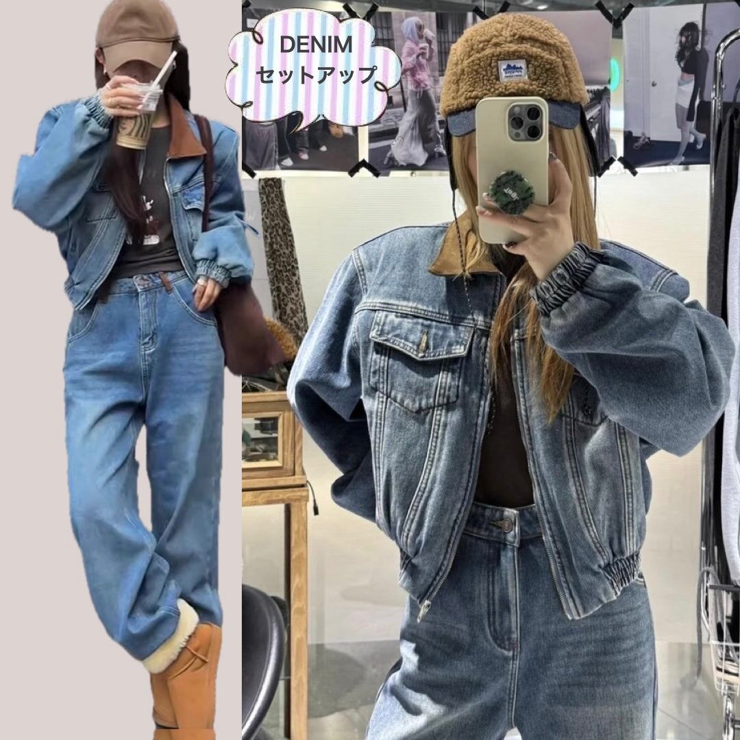 デニム セットアップ レディース クロップド ブルゾン パンツ 上下セット 韓国 ファッション ユーズド加工 デニムオンデニム