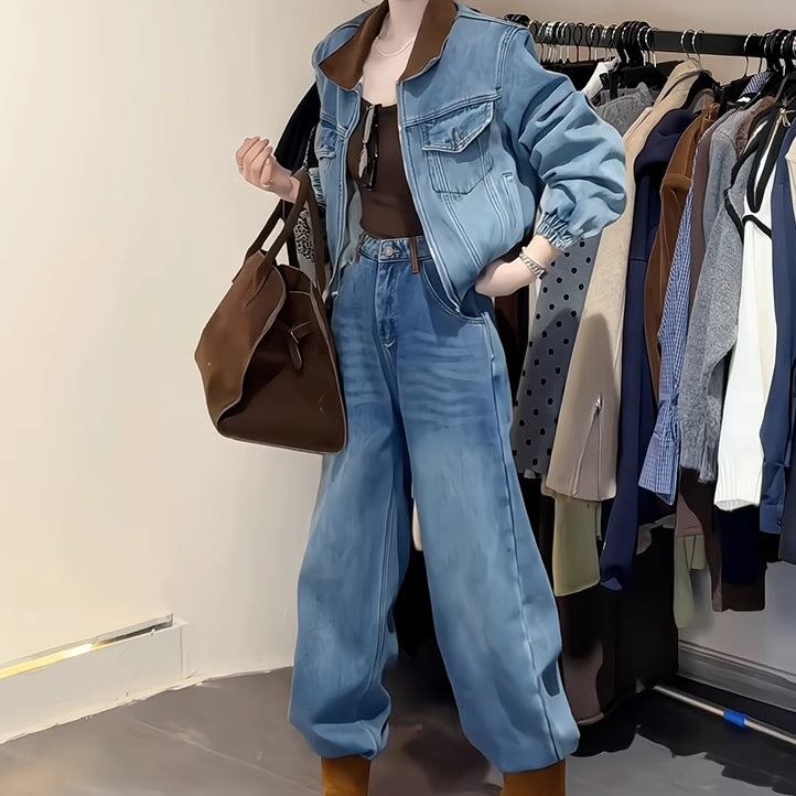 デニム セットアップ パンツ ブルゾン レディース 韓国 ファッション デニムオンデニム 異素材ミックス デニムパンツ ジョガーパンツ ショートジャケット ジップアップ