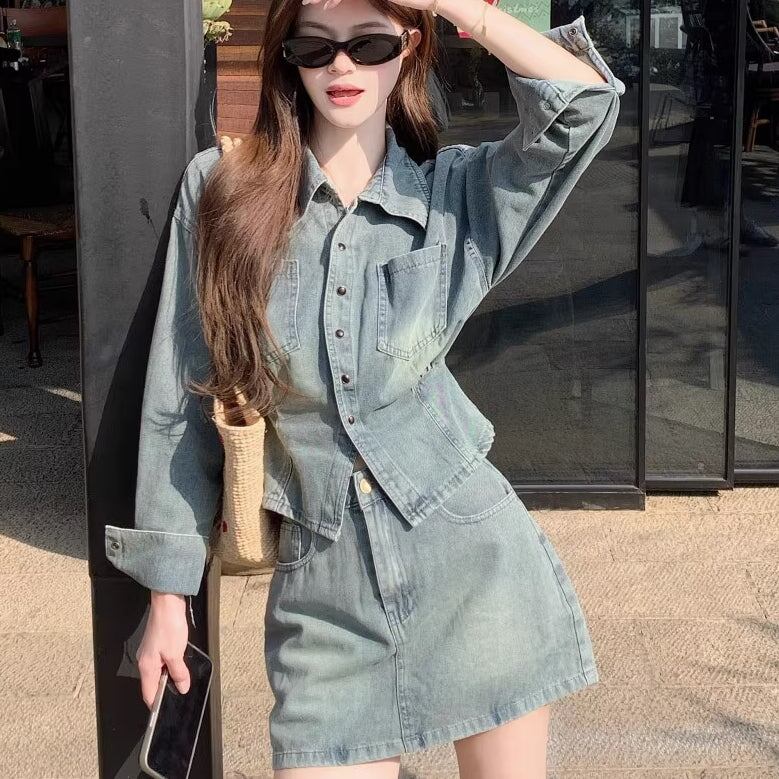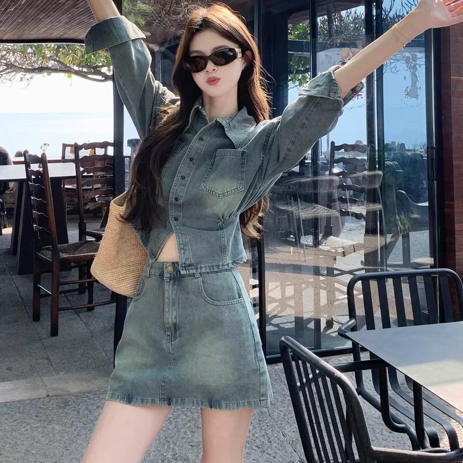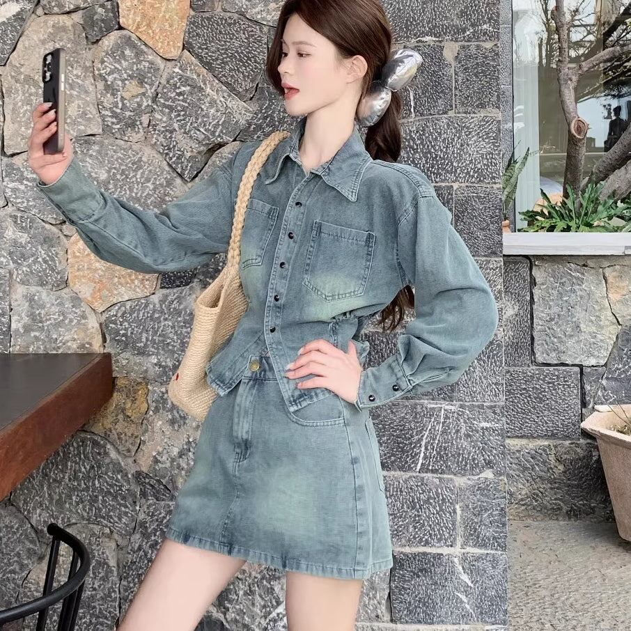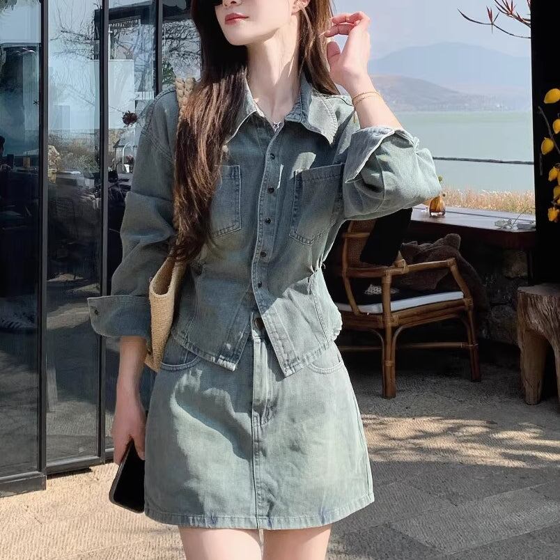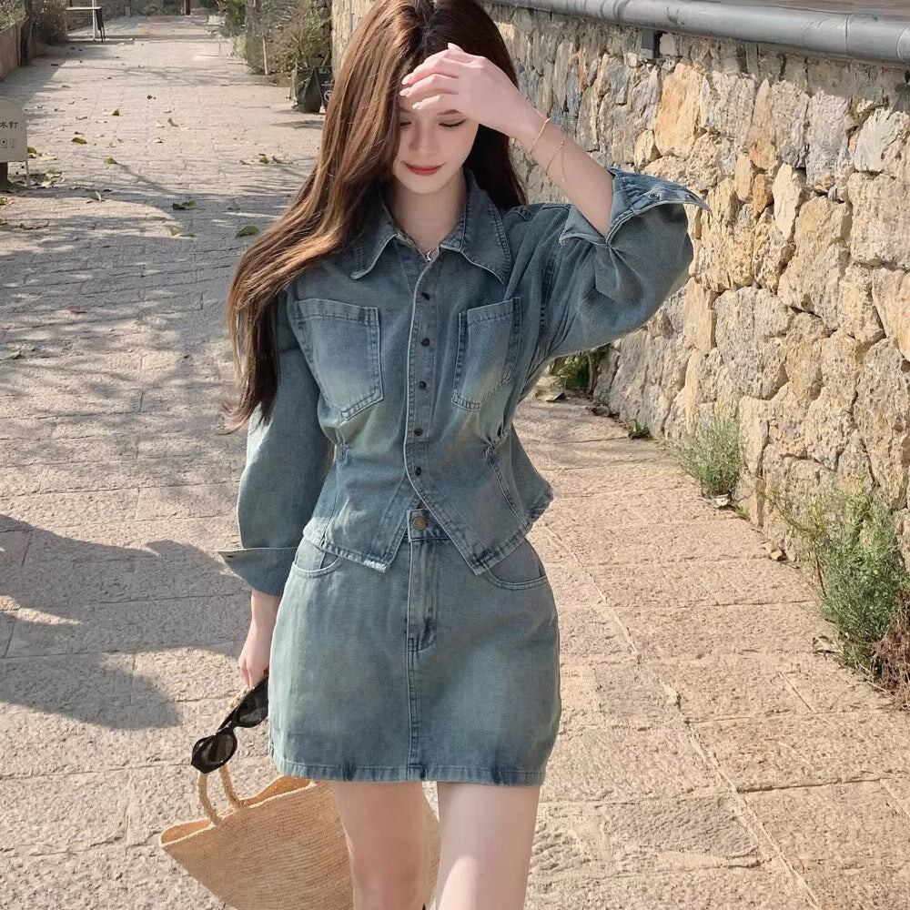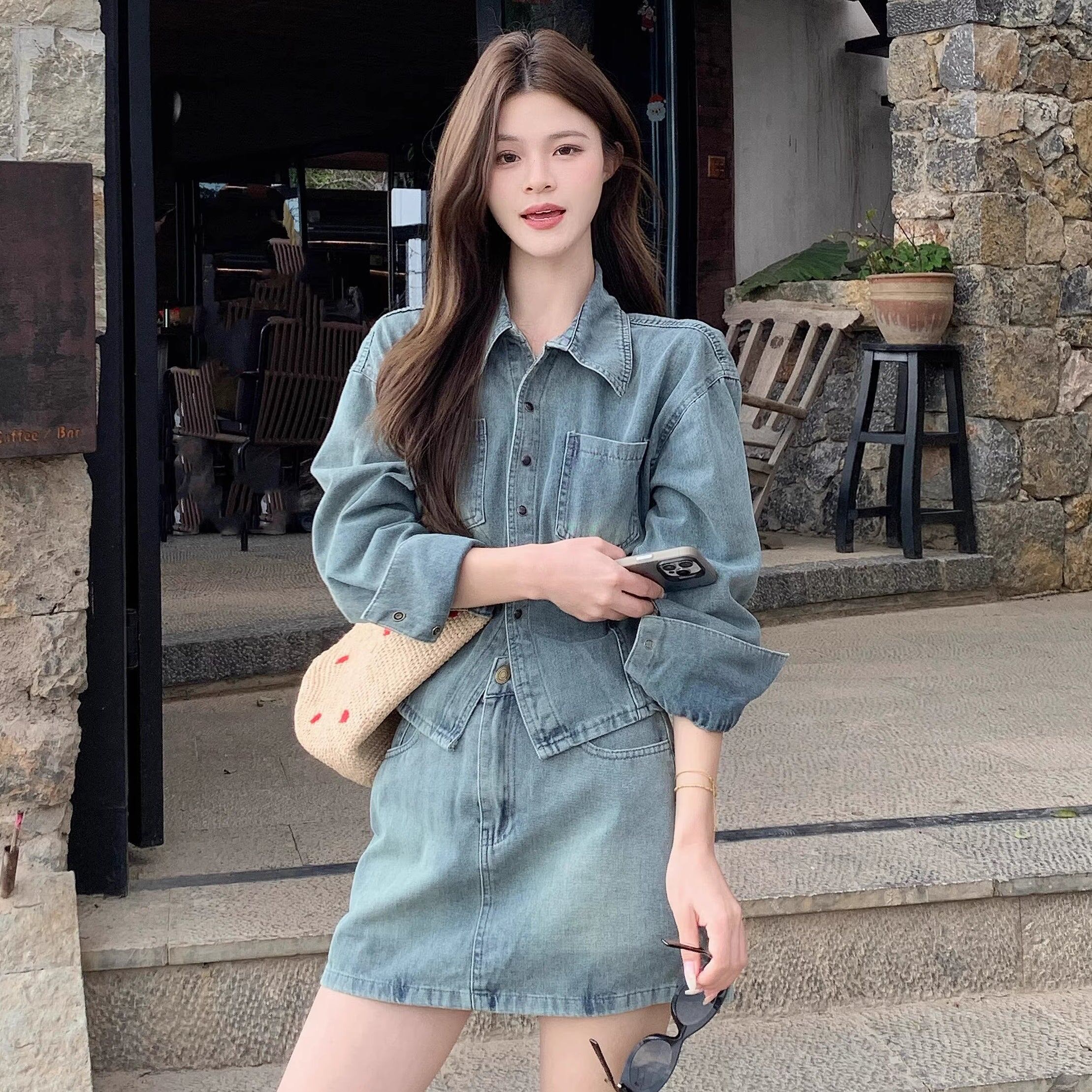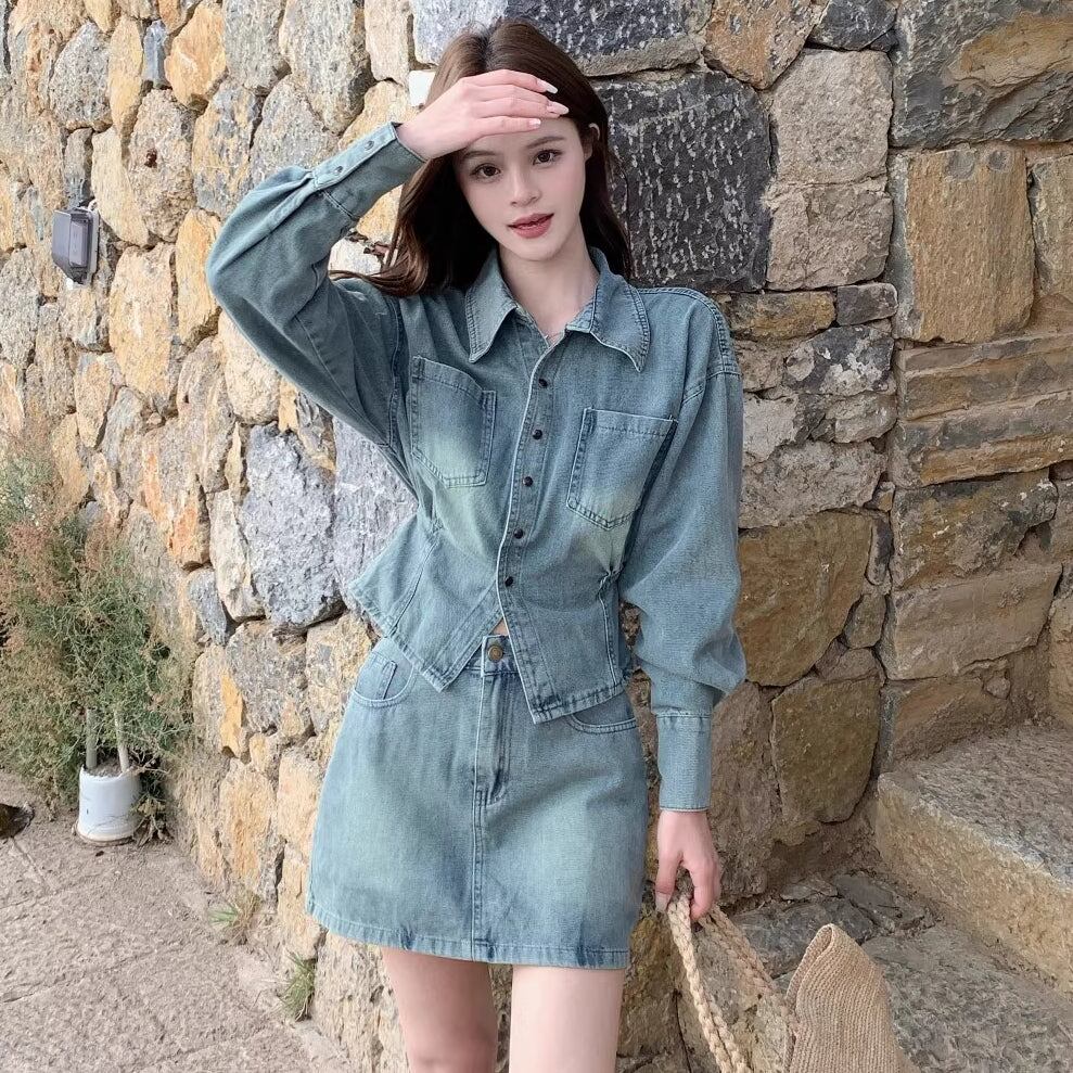 デニムセットアップ? シャツ 台形スカート レディース 韓国 ファッション ウエストシェイプ ダンガリーシャツ ミニスカート デニム ダメージ加工 きれいめデニム ガーリー