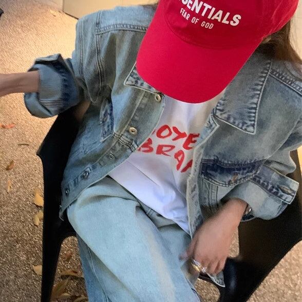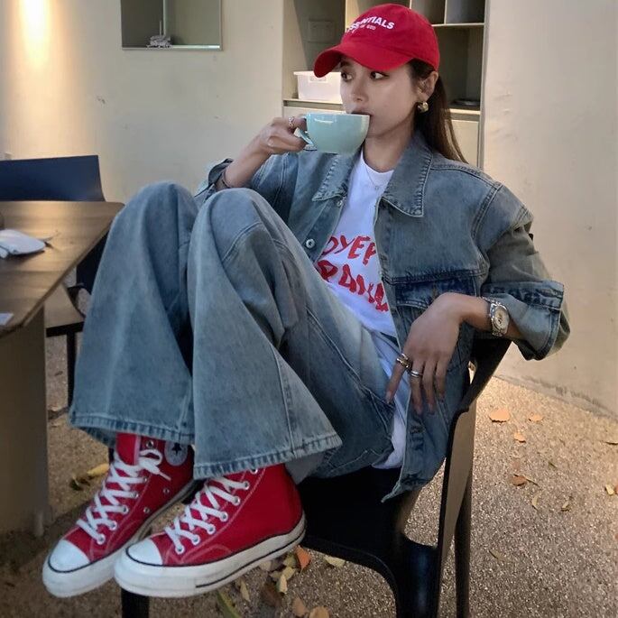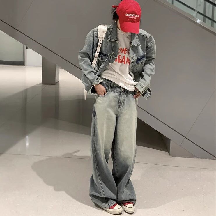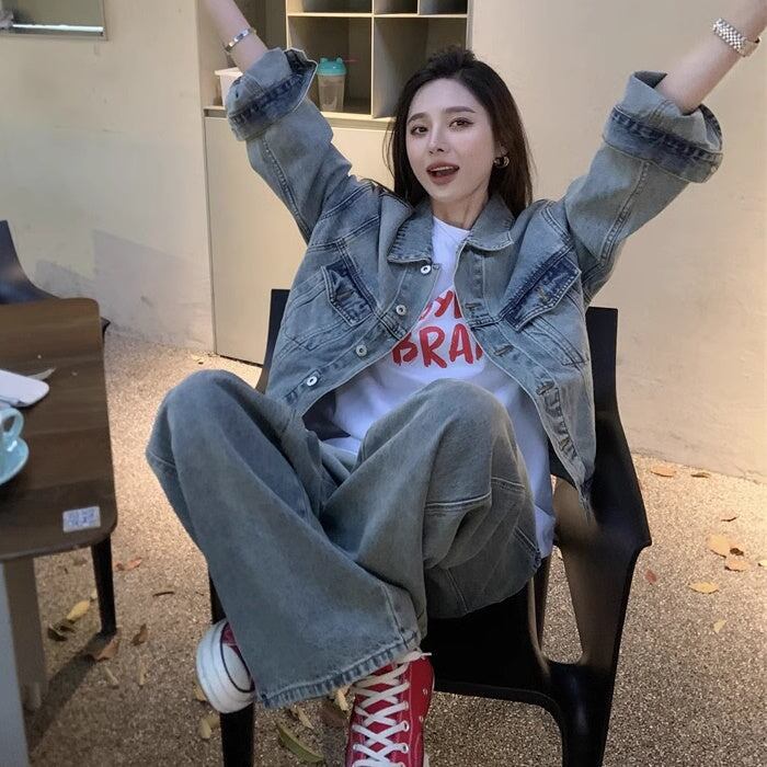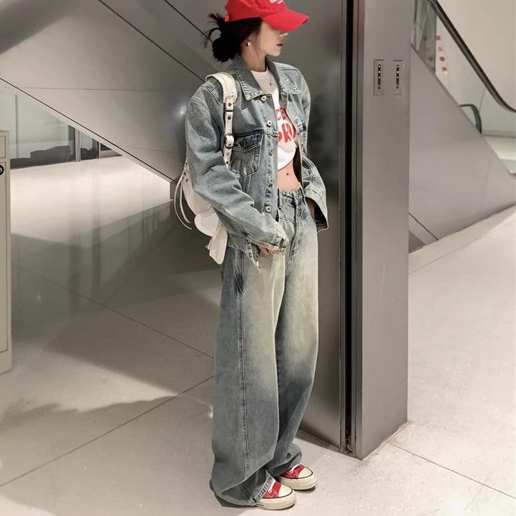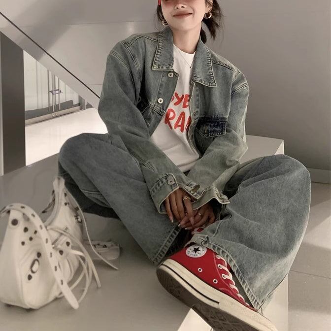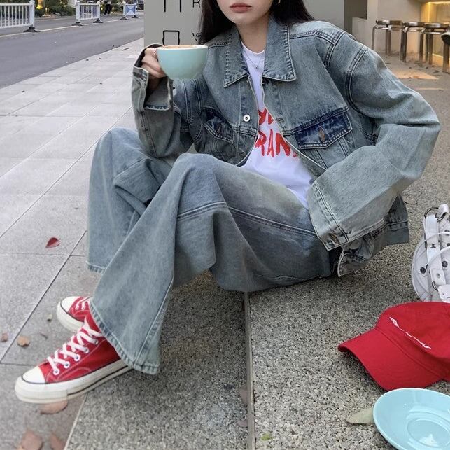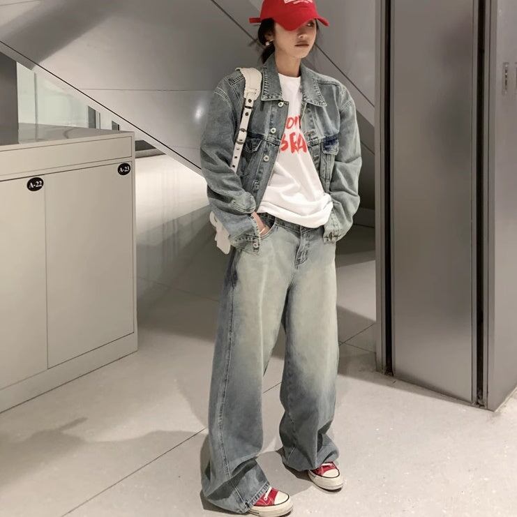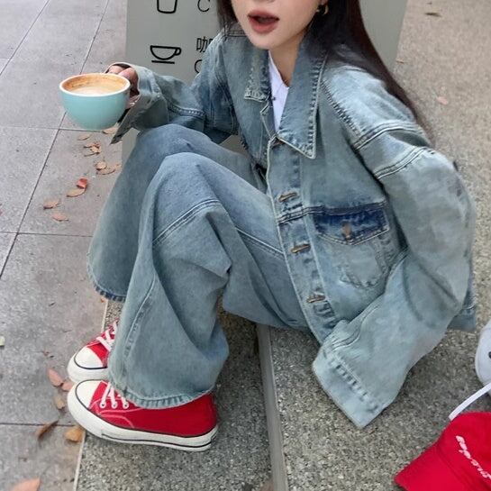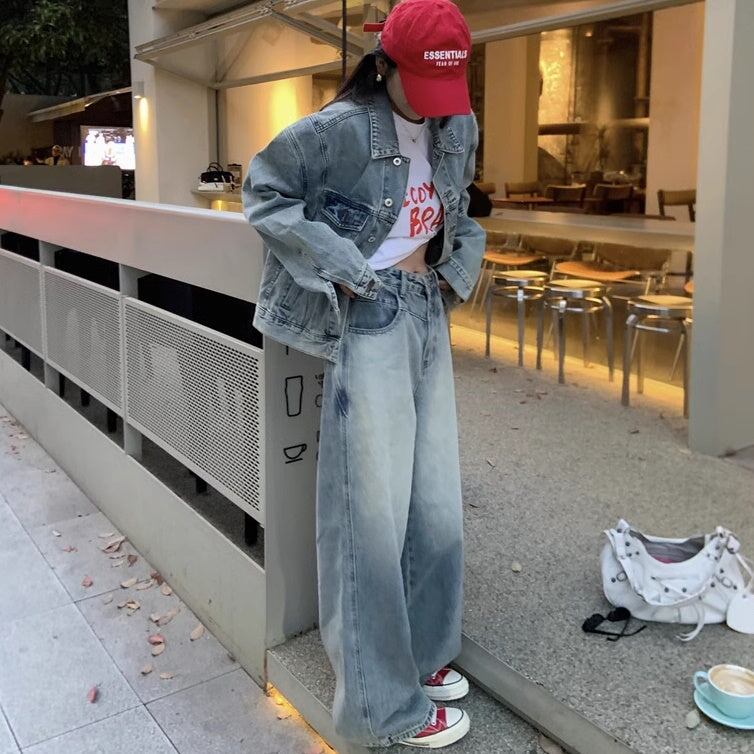 デニムセットアップ ジャケットパンツ レディース 韓国 ファッション ライトブルー オーバーサイズ ビッグシルエット ワイドデニムパンツ デニムジャケット