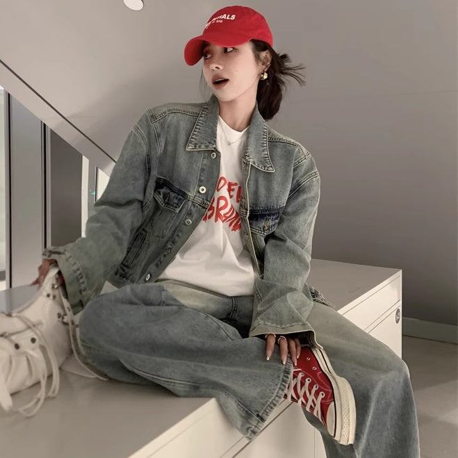 デニム セットアップ レディース ジャケットパンツ 上下セット 韓国 ファッション ライトブルー ヴィンテージ加工