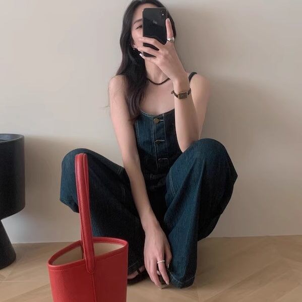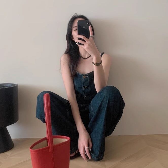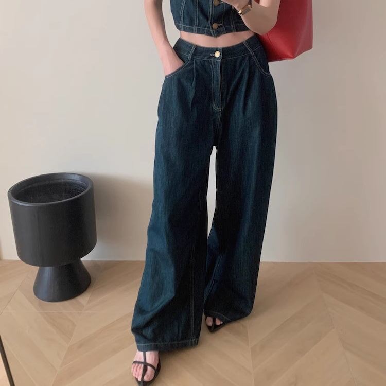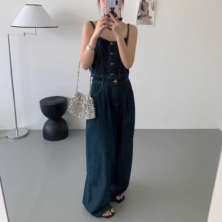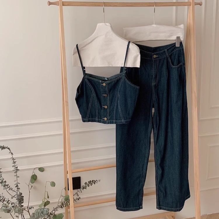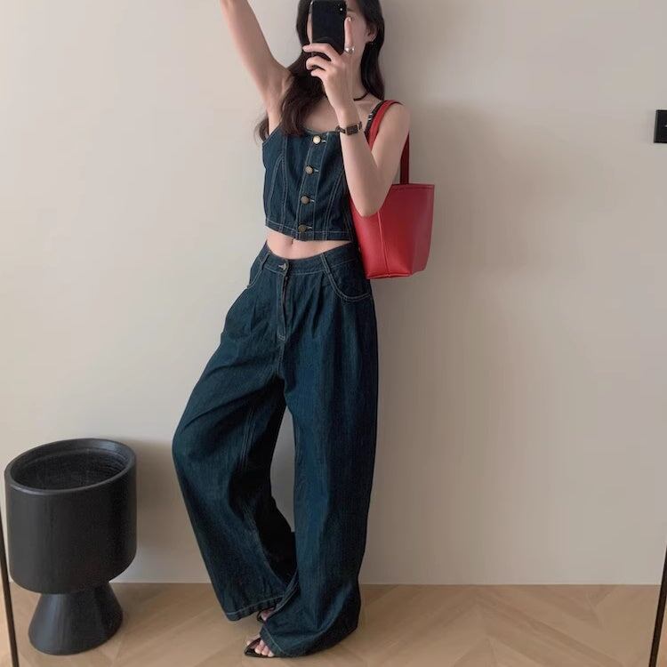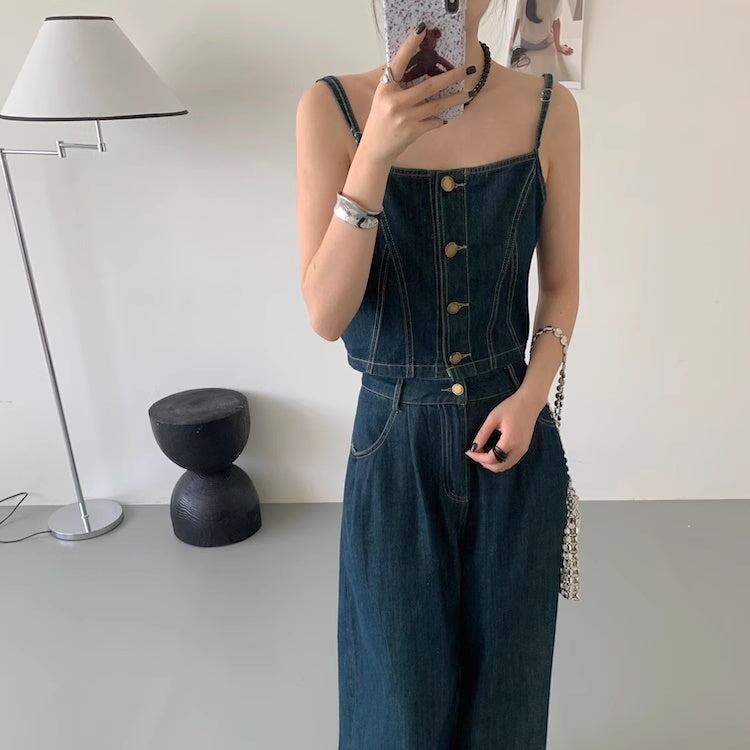 セットアップ デニム レディース 韓国 ファッション キャミソール ビスチェ クロップドトップ ワイドパンツ デニムパンツ インディゴデニム ブルー 夏デニム