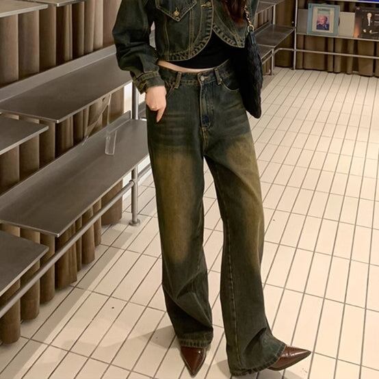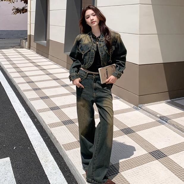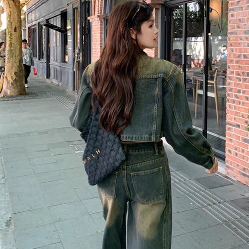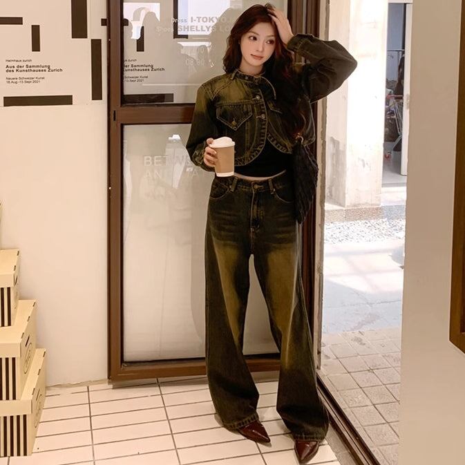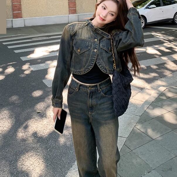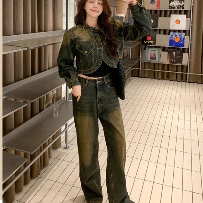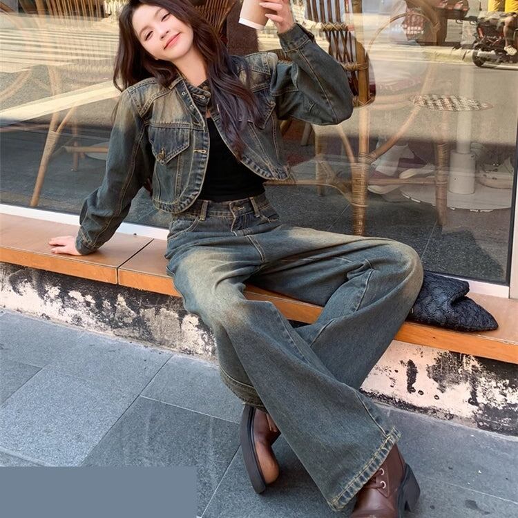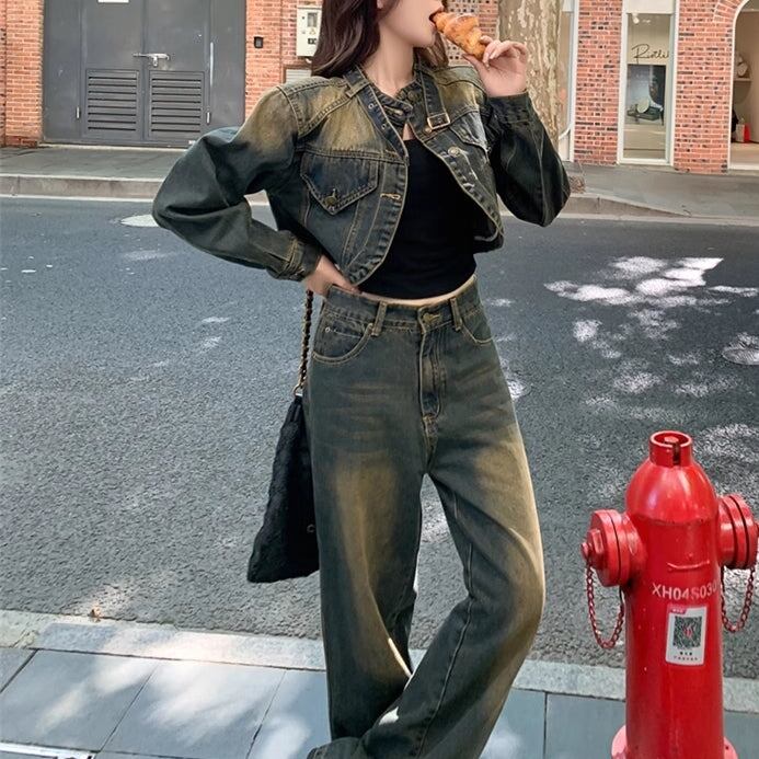 デニム セットアップ レディース ユーズド加工 韓国 ファッション クロップド デニムジャケットワイドパンツ ヴィンテージデニム