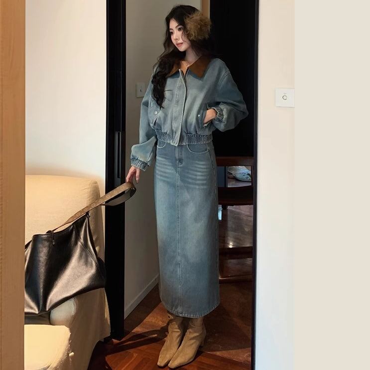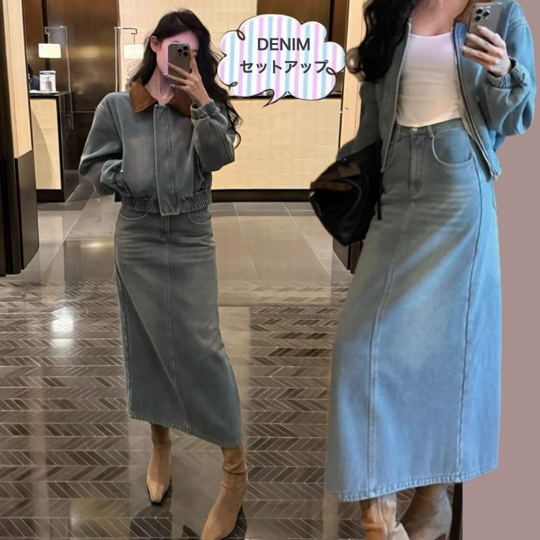 デニム セットアップ レディース ロングスカート ジャケット 上下セット 韓国 ファッション ショート ブルゾン ナロースカート